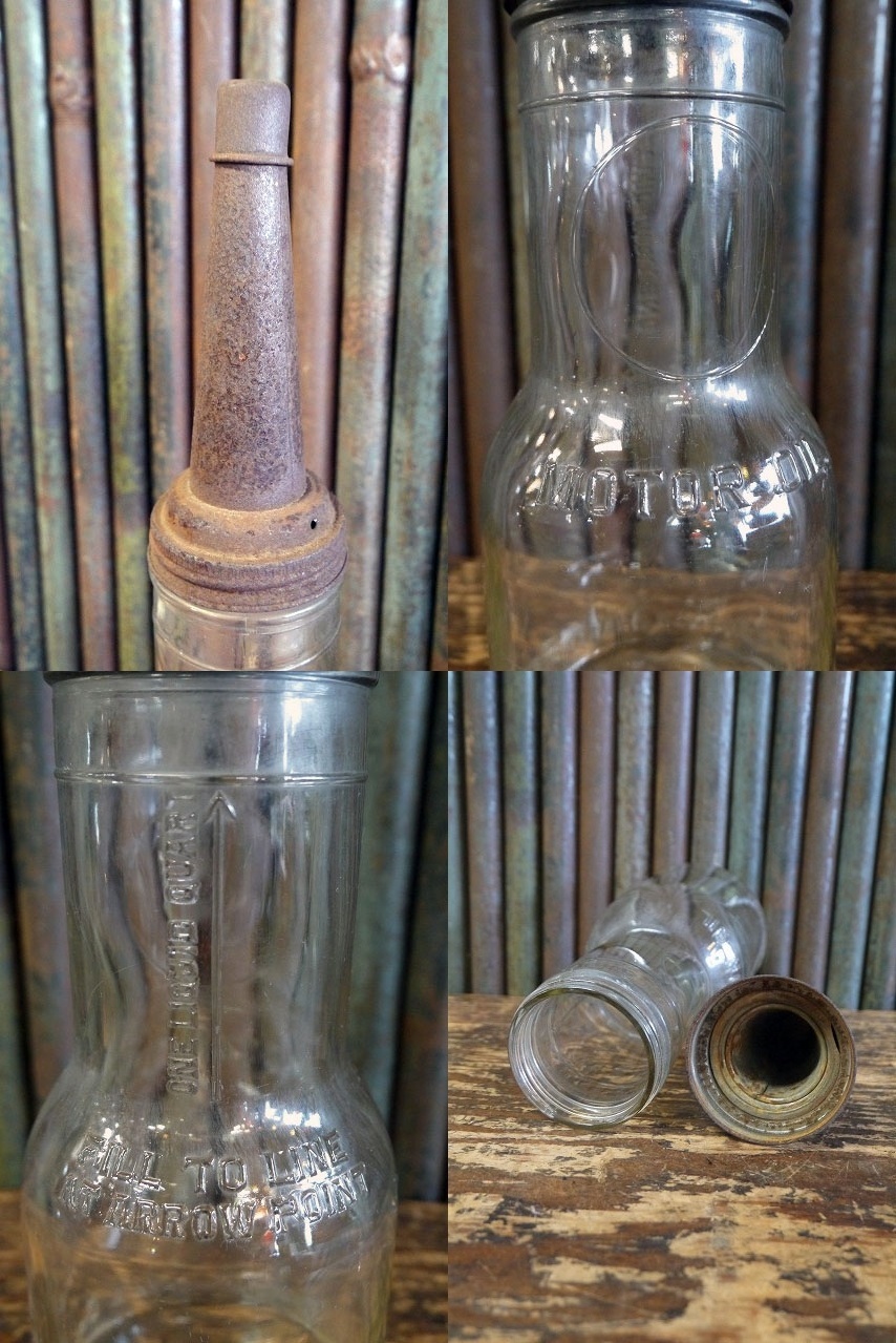アメリカで買い付けてきたビンテージのSHIELDS HARPER MOTOR OIL ガラス瓶 です。重量感のあるガラスにリアルなメタルの風合い&エンボスロゴデザインがとても雰囲気がありかっこいいです。ガラス×メタルキャップ、年代の表記はありませんがデザインから1940年代前後頃かと思います。状態ですがキャップに金属特有の劣化、サビ汚れ、ガラスにくすみや内側OIL汚れいった使用感はありますが、ガラス部分に割れもなく、デイスプレイには問題ない状態です。ただあくまでビンテージですので理解のある方のご購入をお願いします。