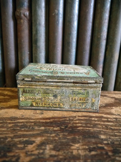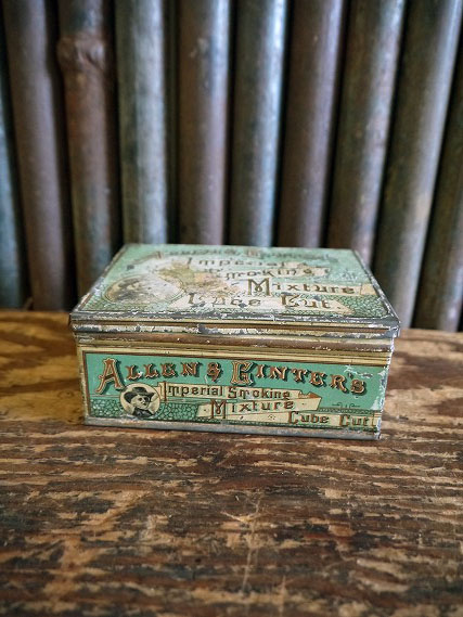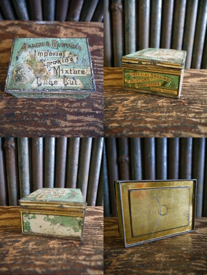 アメリカで買い付けましたアンティークの ALLEN&GINTER'S ブリキ缶です。アンティークならではの大変味のあるアメリカンでクラシカルなロゴデザインでとても雰囲気があります。タバコメーカーのケースになります。ブリキ素材で、ちょっとした小物の収納やディスプレイとしておすすめです。表記はございませんがデザインから1900年代前後頃かと思います。状態ですが多少の汚れ、錆び、凹み、歪み、小傷、テープ貼り等はありますがビンテージならではのとても雰囲気のある状態です・。あくまでビンテージですのでご理解いただける方のご購入をよろしくお願いします。