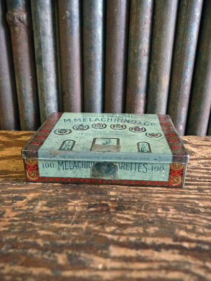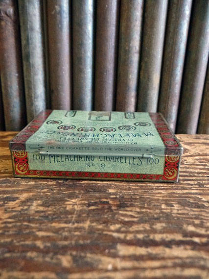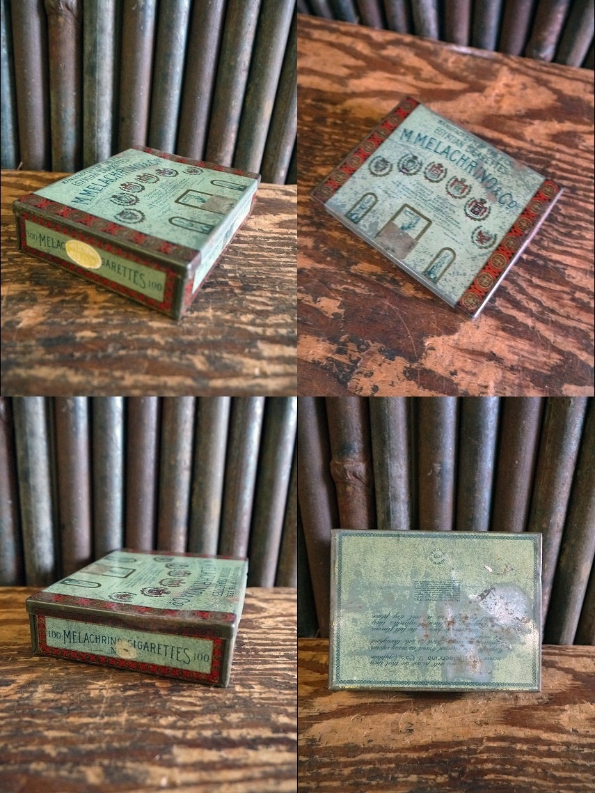 アメリカで買い付けましたアンティークのM.MELEACHRINO&COブリキ缶です。アンティークならではの大変味のあるアメリカンでクラシカルなロゴデザインでとても雰囲気があります。タバコメーカーのケースになります。ブリキ素材で、ちょっとした小物の収納やディスプレイとしておすすめです。表記はございませんがデザインから1900年代前後頃かと思います。状態ですが多少の汚れ、錆び、凹み、歪み、小傷、テープ貼り等はありますがビンテージならではのとても雰囲気のある状態です。あくまでビンテージですのでご理解いただける方のご購入をよろしくお願いします。