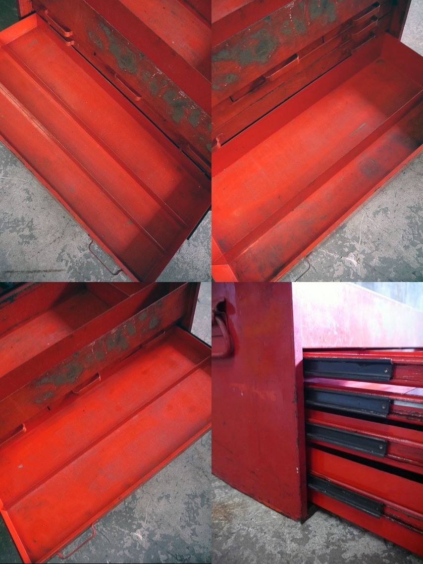 アメリカで買い付けましたビンテージのSnap-On TOOLキャビネットです。実際に使用されていたリアルなメタルの風合い&色褪せたカラーリングにOLDロゴデザインが抜群に雰囲気があります。当時のオリジナル塗装で、年代の表記はありませんがデザインから1940年代頃になります。フロントはガルウィング仕様、内側には4段の引き出し仕様で、非常に重厚感があり存在感抜群ですので、ガレージやショップのディスプレイ什器におすすめです。鍵や鍵金具はありませんが、扉の開閉には問題ありません。状態ですが画像にあるように、経年による使用感で全体的に金属劣化やペイント塗装の剥がれやリペイント、OIL汚れや細かい角や天板の凹みや剥がれなどはありますが、雰囲気を著しく損なうようなダメージはなく実用、ディスプレイには問題ない状態です。あくまでビンテージになりますのでご理解いただける方のご購入をよろしくお願い致します。