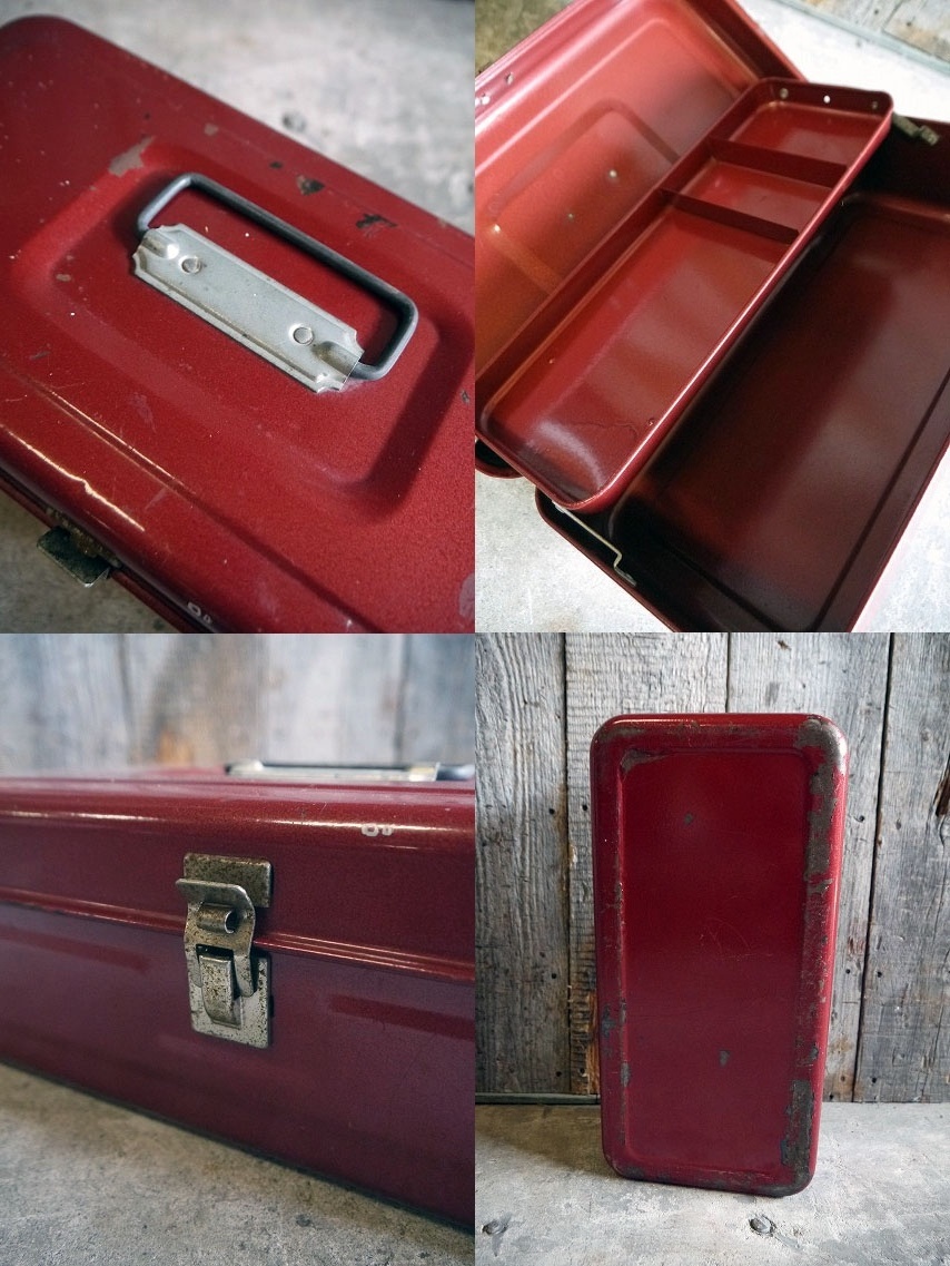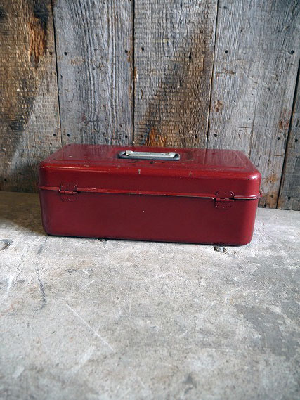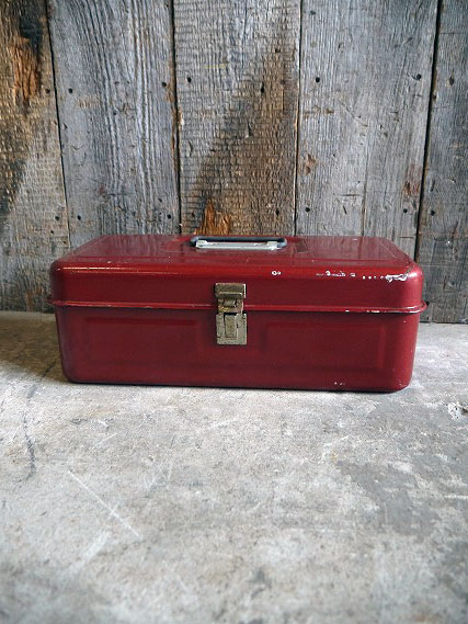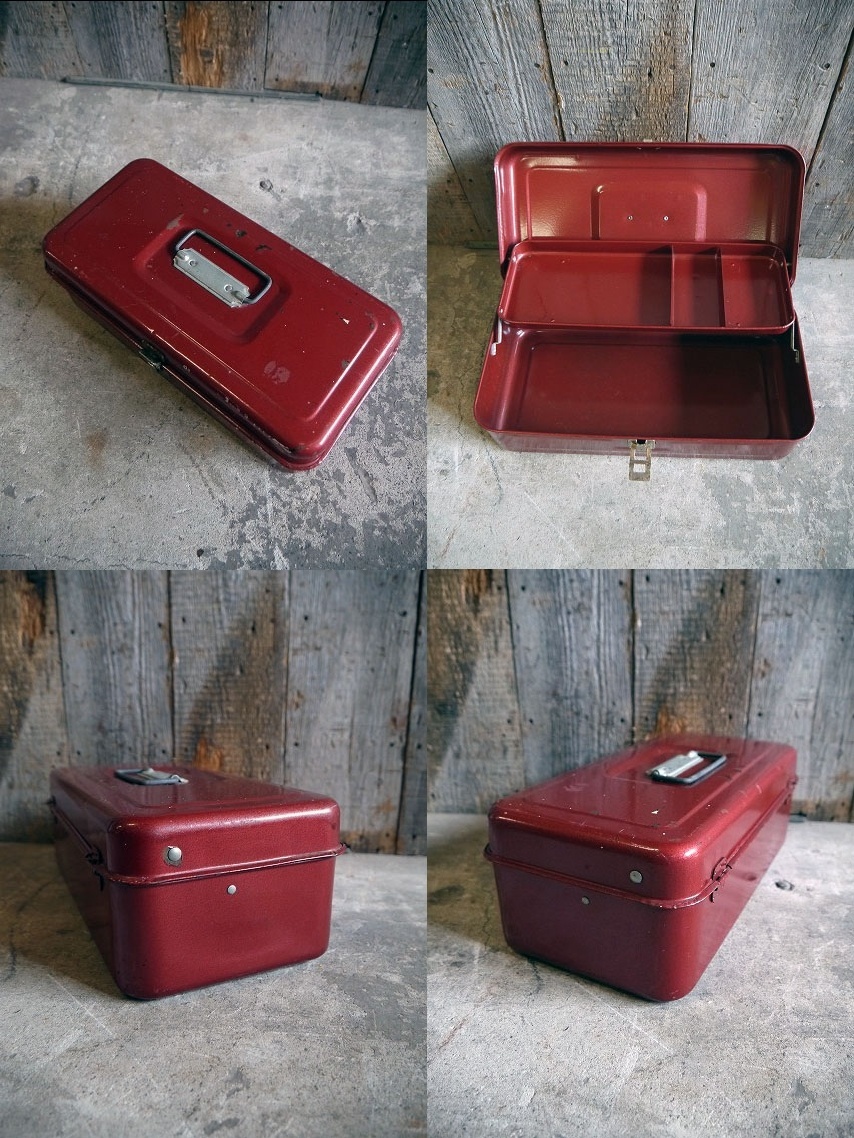 アメリカで買い付けましたビンテージのMETALタックルBOXです。淡いカラーにリアルなメタルの風合い&シンプルなデザインもとても雰囲気があります。野池に軽くフィッシングに行く時や、パーツや工具の保管にちょうど良いサイズです。軽いメタル素材で、金具部分のロックや上蓋の開閉は特に問題ありません。年代の表記はありませんがデザインから1970〜80年代頃になるかと思います。状態ですが、経年による汚れ、擦れ、サビ、上蓋に凹み傷、画像の様に淵に細かい切れや使用感等はありますが雰囲気を損なう様な目立つダメージもなく全体的には実用にも問題ない状態です。あくまでビンテージですのでご理解いただける方のご購入をよろしくお願いします。