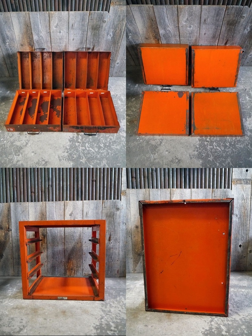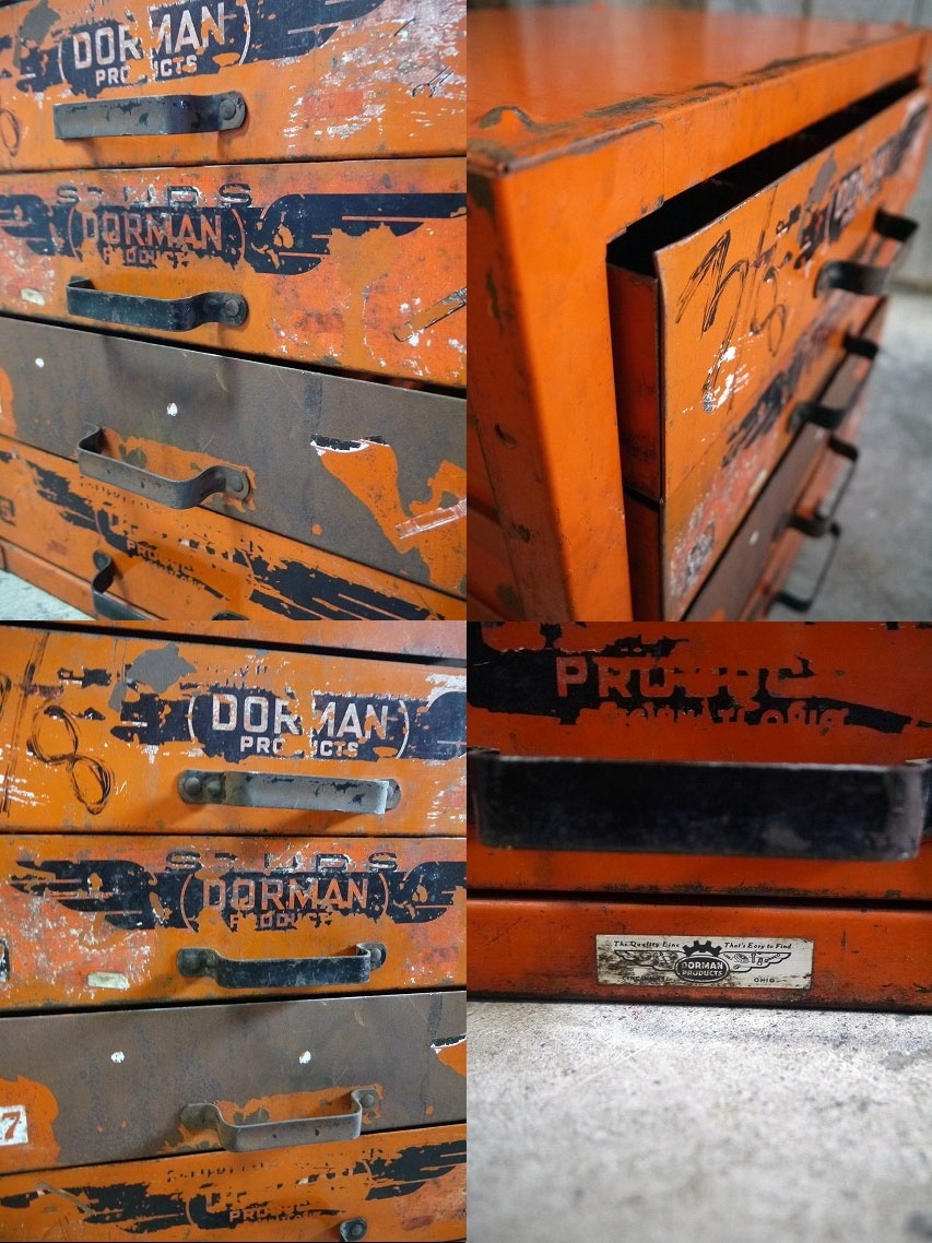 アメリカで買い付けましたビンテージのDORMANパーツキャビネットです。オレンジカラーに重量のあるメタルの風合い&シンプルなデカールロゴデザインがとても雰囲気がありカッコイイです。重量のあるメタル素材の非常にしっかりとした作りで、計4個の収納ケース仕様で使いやすく、実用兼ディスプレイとしてお勧めです。仕切り部分は固定式で取り外し不可になります。年代の表記はございませんがデザインから1960年〜70年代前後頃になるかと思います。BOXの番号はバラバラですが同年代になりますので違和感はありません。状態ですが画像にあるように経年による金属劣化、傷やOIL汚れ、画像の様にフレームに多少の歪みや凹み、ステッカー部分の剥がれや汚れ等はありますが、非常にしっかりした作りで、BOXの開閉スライドも比較的スムーズで実用にも問題ないレベルです。あくまでビンテージになりますので理解のある方のご購入をお願いします。