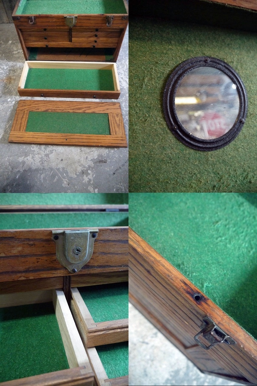 アメリカで買い付けましたアンティークのWOOD TOOL BOXです。渋いカラーリングにリアルなウッドの風合いにレザーハンドルデザインがとても雰囲気良くカッコイイです。ウッド素材のしっかりとした作りで、ガレージ等のディスプレイ兼工具などの収納にとても便利なBOXです。年代の表記はありませんが、ロゴプレートや上側のレザー持ち手デザインから1930〜40年代前後頃になるかと思います。引き出しBOXのスライドは今の所は比較的スムーズです。上蓋を閉めるとフロントの扉部分が上側2か所の棒にてロックしますが、片側棒部分のロックスプリングが壊れていますが、開閉ロックには問題ありません。(片側の棒にてロックが掛かります。)状態ですが、経年による擦れ、フロント部分の蓋欠損、片側ロック棒の壊れ、傷や汚れ、上側レザーハンドルの劣化ダメージ、ミラーに多少のくすみ汚れ、内側に汚れ、金属部分にサビや底面に多少のヒビなどの使用感はありますが、アンティークの雰囲気を損なわない程度で実用にも問題ない程度です。あくまでビンテージですのでご理解いただける方のご購入をよろしくお願いします。