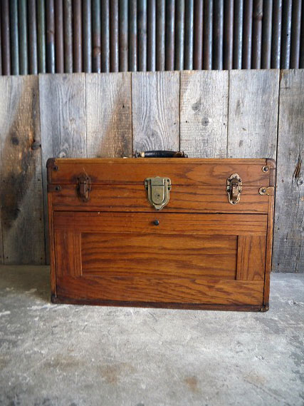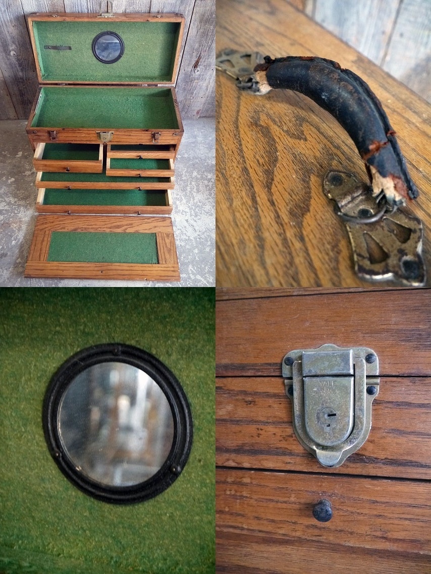 アメリカで買い付けましたアンティークのWOOD TOOL BOXです。渋いカラーリングにリアルなウッドの風合いにレザーハンドルデザインがとても雰囲気良くカッコイイです。ウッド素材のしっかりとした作りで、ガレージ等のディスプレイ兼工具などの収納にとても便利なBOXです。年代の表記はありませんが、装飾金具やウッドデザイン&上側のレザー持ち手デザインから1930〜40年代前後頃になるかと思います。引き出しBOXのスライドは今の所は比較的スムーズです。上蓋を閉めるとフロントの扉部分が上側2か所の棒にてロックしますが、片側棒部分のロックスプリングが壊れていますが、開閉ロックには問題ありません。フロントの蓋は本体と多少の隙間がありますので、上蓋を閉める際にはフロントの蓋は本体とフラットな状態にして下さい。(確認せずに上蓋を閉めると棒先が穴ではなくフロント部分に出てします場合がありますでご注意下さい。)状態ですが、経年による擦れ、片側ロック棒の壊れ、傷や汚れ、上側レザーハンドルの劣化ダメージ、ミラーに多少のくすみ汚れ、上蓋横金具のネジパーツ欠損、内側に汚れやフェルトに破れ等のダメージ、鍵の欠損、内側中央部分にピンホール、金属部分にサビや底面に多少のヒビなどの使用感はありますが、アンティークの雰囲気を損なわない程度で実用にも問題ない程度です。あくまでビンテージですのでご理解いただける方のご購入をよろしくお願いします。
