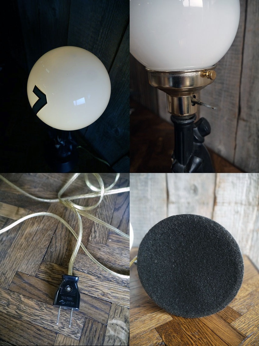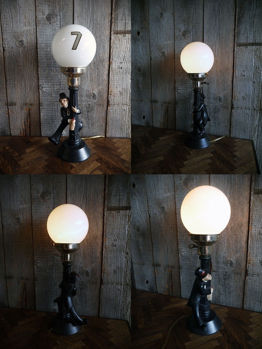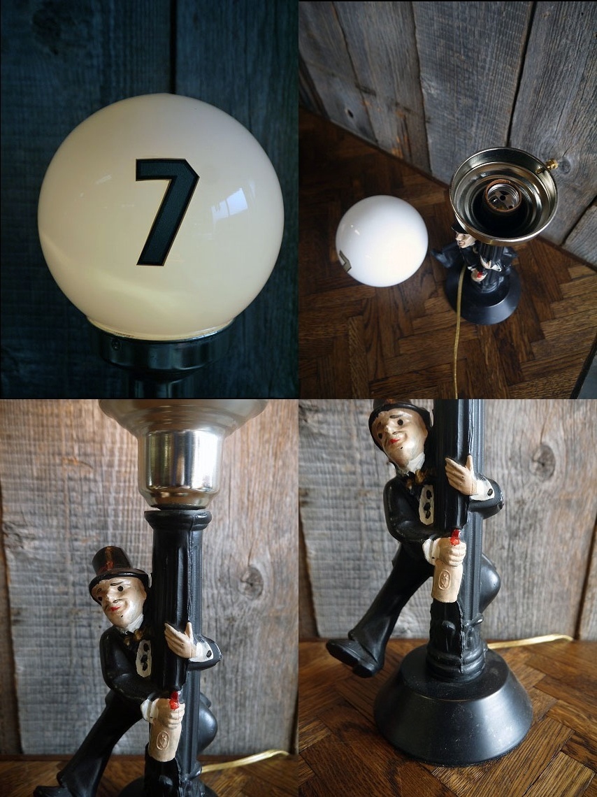 アメリカで買付けましたビンテージのBARランプです。街路灯に酔っぱらってしがみついている可愛らしいデザインで、画像の様に明かりと付けると非常に綺麗でお店等のディスプレイとして最適です。上側ミルクシェードはガラス製で7のデカールはカスタムになります。(1950年代頃の古いデカールになります。)上側のつまみを回すとON/OFFの切り替えになりますBAR内側の電球は撮影用で付属しませんので、市販の26mm口径の一般的なタイプでご用意ください。年代の表記はありませんがデザインから1960〜70年代前後頃になるかと思います。コンセントコード部分&底フェルトは新品に交換済みになります。状態ですが小傷、汚れ、擦れや細かい塗装剥がれ、内側ソケット内側ペーパーに部分破れや底面フェルトの交換などはありますが、今のところライトも画像の通り点灯確認済みで、ディスプレイには問題ない状態で良いです。ただあくまでビンテージになりますのでご理解いただける方のご購入をよろしくお願いします。