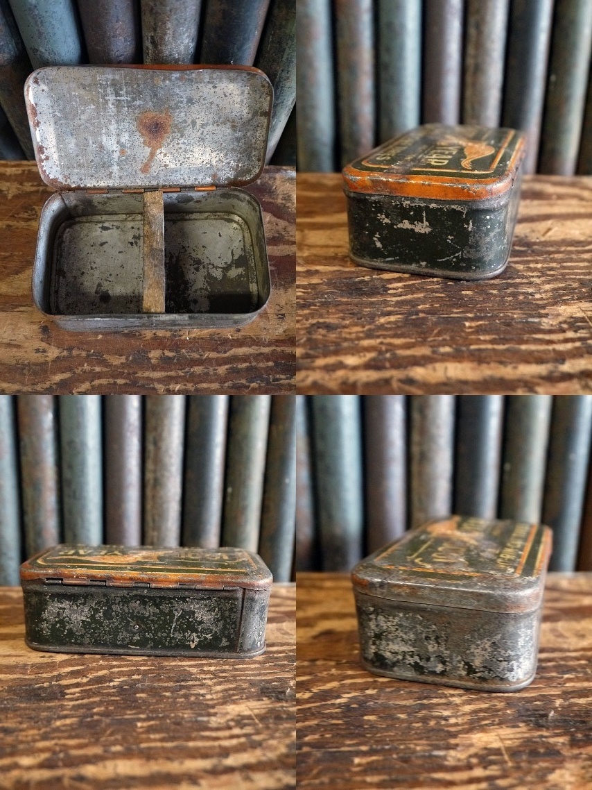 アメリカで買い付けましたアンティークのGOODYEARブリキケースです。渋いカラーにメタルの風合い&OILアメリカンなロゴデザインもとても雰囲気があります。軽いブリキ素材で、デザインから1910年代頃の古いリペアキットケースになります。状態ですが多少の錆び、傷、凹みや角に多少の歪み、塗装剥がれや内側にハンドメイドにウッド仕切り等はありますがビンテージならではのとても雰囲気のある状態です。ただあくまでもアンティークになりますのでご理解いただける方のご購入をお願いします。