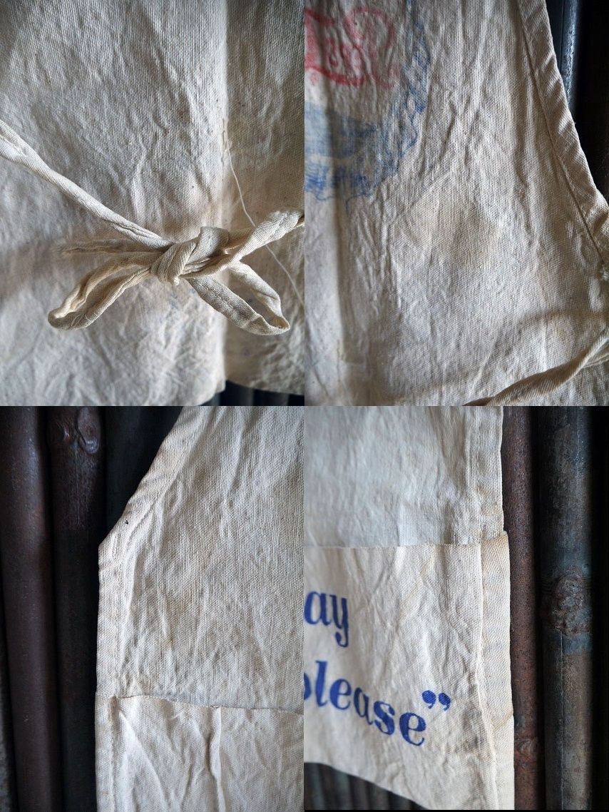 アメリカにて買い付けましたビンテージのPEPSI-COLAエプロンになります。キャンバス生地にOLDアメリカンなロゴデザインがとても雰囲気があります。表記はありませんが生地感から100%コットンの染み込みプリントで、1950年代頃のユースサイズになるかと思います。実用も可能で、ディスプレイとしてもオススメです。状態は経年経過により多少の擦れ、シミ汚れ、細かいステッチ切れや折りたたみシワなどのはありますが、生地もしっかりとしていて良いです。ビンテージアイテムならではの雰囲気のある状態です。ビンテージにご理解のある方のご購入をお願いします。