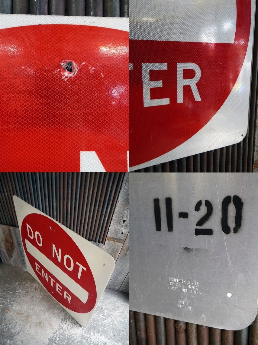アメリカにて買い付けましたUSAのDO NOT ENTER 特大ロードサインです。レッド×ホワイトカラーにシンプルなロゴデザインがカッコいいです。アメリカンな人気定番のアイテムで、ガレージやショップ等のディスプレイに最適です。スチールアルミ素材のプリントデカール(ハニカム&ボーダー使用)の反射板タイプで裏の刻印から2019年2月製になります。状態は多少の擦れ、傷、汚れや取り付け穴上側付近に多少凹み等はありますが、ユーズドジャンク好きの方でしたら問題ないレベルで良いです。あくまでユーズドですのでご理解いただける方の購入をよろしくお願いします。