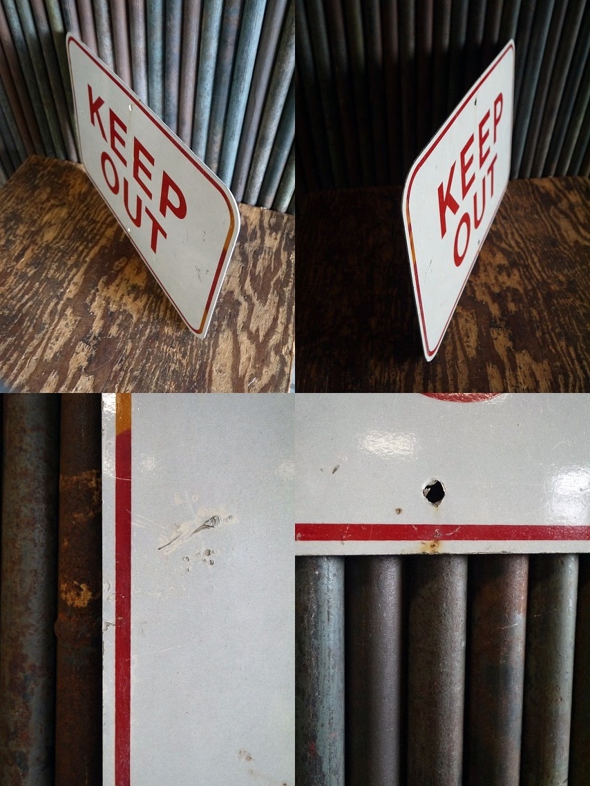 アメリカにて買い付けたビンテージのKEEP OUTロードサインです。人気アイテムで、ガレージやショップ等のディスプレイに最適です。スチールアルミ素材の反射塗料の一体デカールプリントタイプで、年代の表記はありませんがデザインから1990年代頃になるかと思います。状態ですが多少の擦れ、小傷、汚れはありますが、ビンテージジャンク好きの方でしたら問題ないレベルで良いです。あくまでビンテージですのでご理解いただける方の購入をよろしくお願いします。