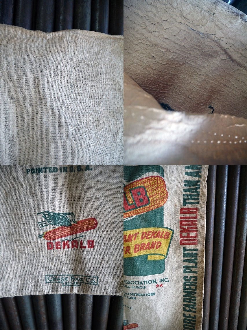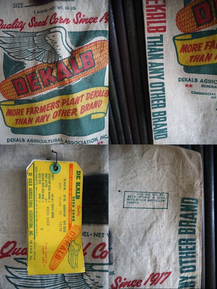 アメリカにて買い付けましたビンテージのDEKALB BAGになります。染み込みプリントに生地の風合いがとてもおしゃれな雰囲気です。生地は目の粗いコットン生地(裏地にはペーパーが貼られています。)でとてもしっかりとしています。当時アメリカのトウモロコシの種子用の収納袋になります。古い商品になりますの実用はできませんので、コレクション&ディスプレイとしてご使用下さい。伝票に12-58のスタンプ表記がありますので1958年12月製になります。状態ですが、多少の擦れ汚れ、糸を外したステッチ穴などはありますが、ディスプレイには問題ない雰囲気のある状態で良いです。あくまでビンテージになりますのでご理解いただける方のご購入をよろしくお願い致します。