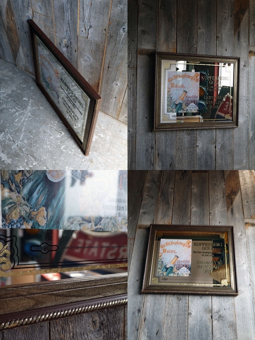 アメリカにて買い付けましたビンテージのKUPFERBERG GOLD パブミラーです。ドイツのワインブランド銘柄のパブミラーで、オシャレなデザインと木枠フレームの風合いもとても雰囲気があります。ウッド×ガラス素材で、表記ありませんがデザインから1990年代頃のパブミラーになるかと思います。手頃なサイズで、お部屋からショップのディスプレイまで幅広くおすすめです。状態ですが、木枠に傷や擦れやチップ、ミラーのくすみや内側に多少の汚れ、擦れ、裏側ペーパーの交換、フレーム接合部分に多少の隙間などはありますが雰囲気を損なうような目立つダメージはなく、ディスプレイには問題のない状態です。あくまでビンテージのためご理解いただける方のご購入をお願いします。
