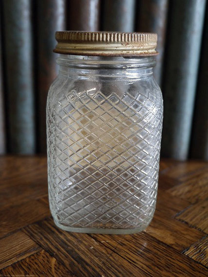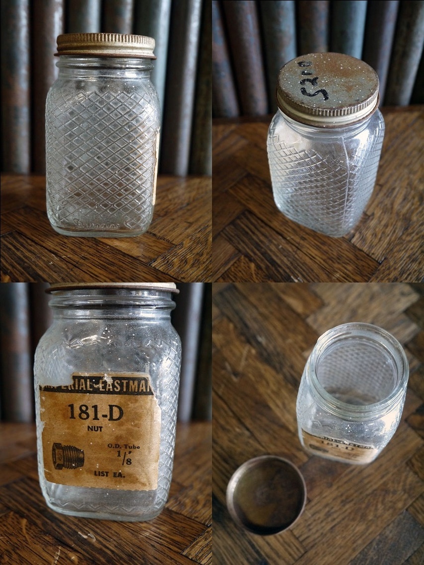 アメリカで買い付けてきたビンテージのIMPERIAL₋EASTMAN PARTS ガラス瓶 です。MOTORパーツメーカーの収納瓶で、重量感のあるガラスに格子模様のデザイン&ペーパーデカールがとても雰囲気がありかっこいいです。ガラス×メタル蓋、側面のエンボスロゴからDURAGLAS社製、ガレージなどの実用兼ディスプレイとして大変おすすめです。底の刻印に37の表記がありますので1937年製になります。状態ですが上蓋に金属特有の劣化、サビやマジックロゴ、ガラスにくすみ、傷や擦れ、汚れ、ペーパー部分の劣化ダメージといった使用感はありますが使用に差し支えがでるような目立つダメージもなく実用にも問題ない状態です。ただあくまでビンテージですので理解のある方のご購入をお願いします。