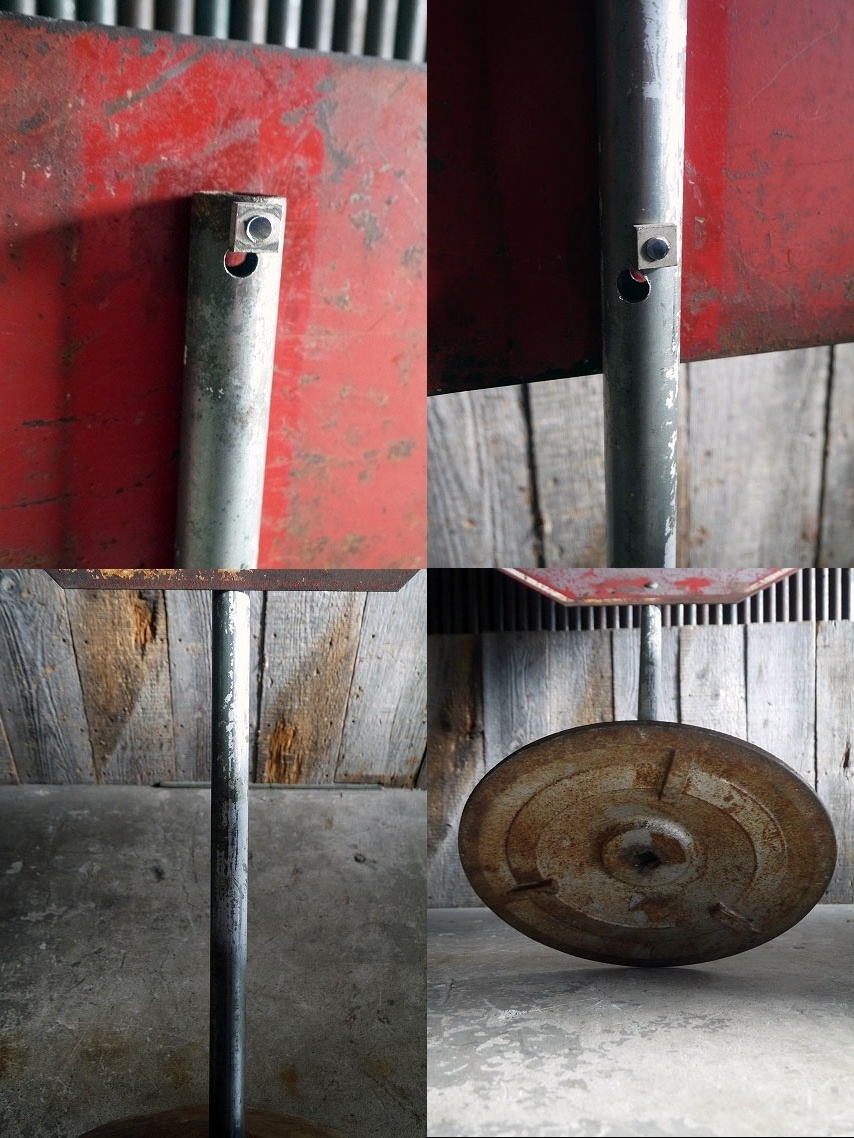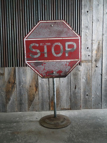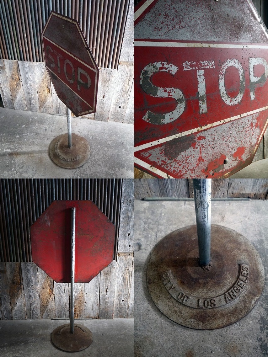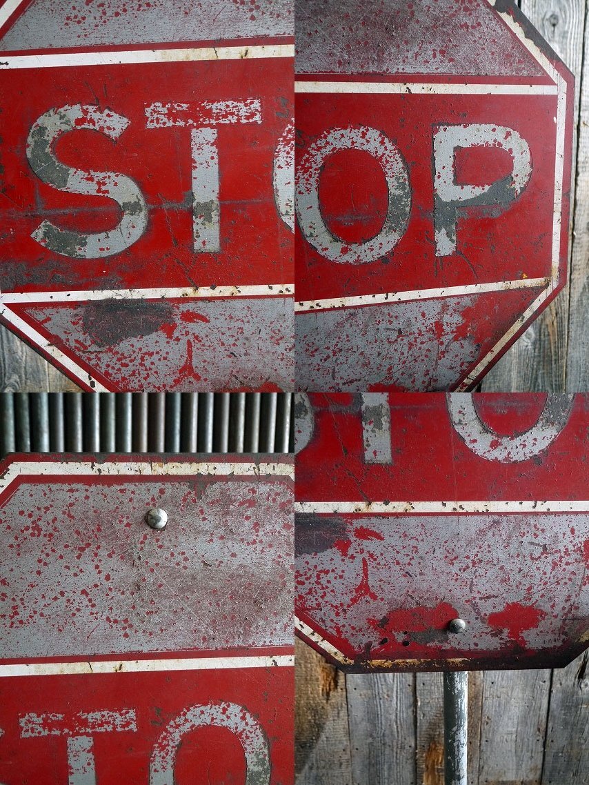 アメリカにて買い付けましたビンテージSTOPロードサインです。色褪せたレッドカラーにシンプルなロゴデザインとリアルな塗装剥がれが雰囲気がありかっこいいです。重量のあるメタル素材のペイント一体の反射板仕様で、表記はありませんがデザインから1950〜60年代前後頃になるかと思います。ポール土台は後付けにはなりますが同年代頃のオリジナルになります。人気アイテムでガレージやショップ等のディスプレイに最適です。状態ですが多少の擦れ、傷、汚れ、画像の様なカケ、ポール裏側に2か所穴、塗装劣化等ははありますが、ビンテージジャンク好きの方でしたら恐らく問題ないレベルで、ディスプレイには問題ない雰囲気のある状態です。あくまでビンテージですのでご理解いただける方の購入をよろしくお願いします。