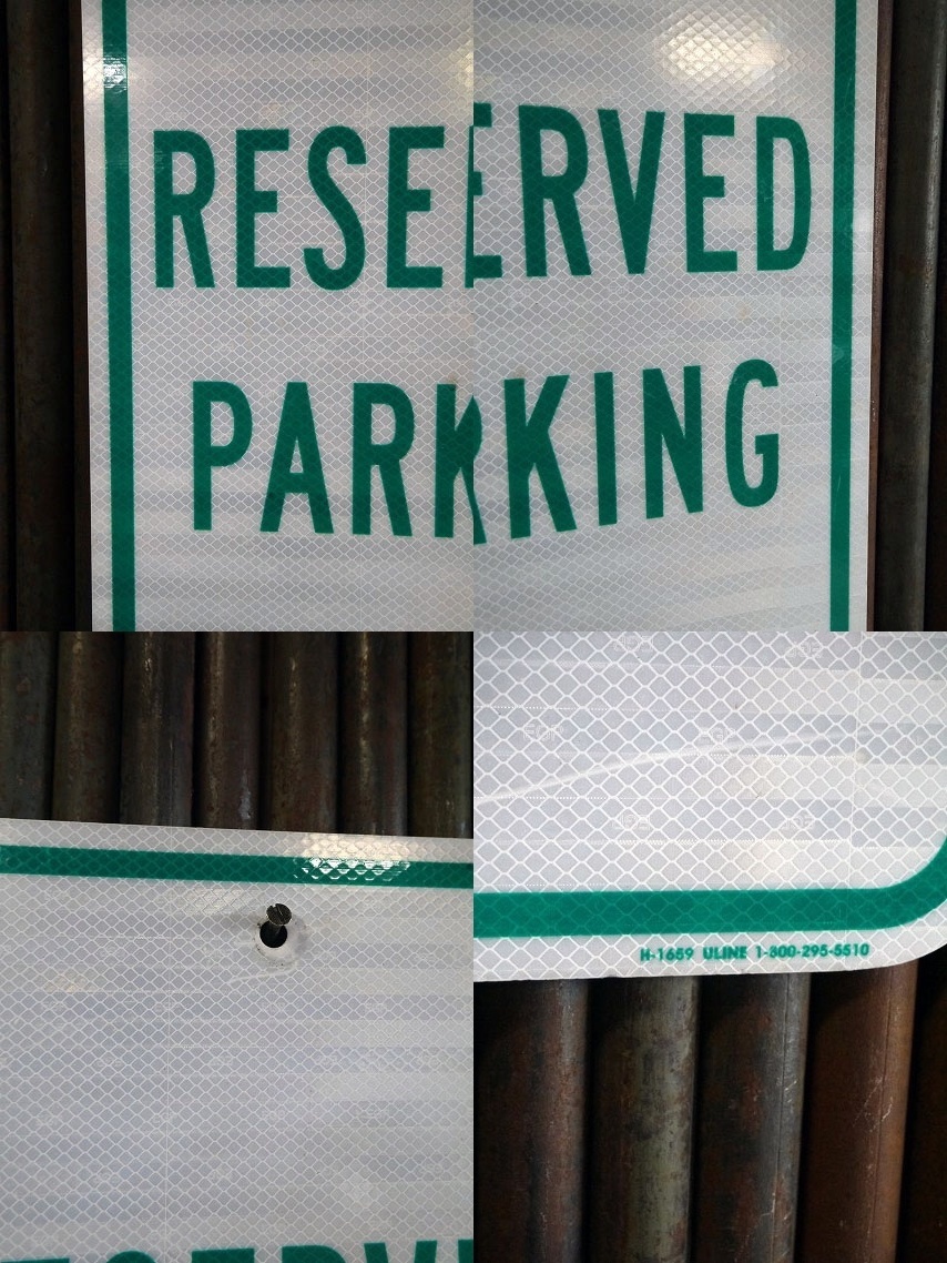 アメリカにて買い付けたUSAのRESERVED PARKINGロードサインです。人気アイテムでガレージやショップ等のディスプレイに最適です。スチールアルミ素材のプリントデカール(ハニカム&ボーダー使用)の反射板タイプで2000年以降の比較的新しい年代になります。ガレージやお店のディスプレイとしておすすめです。状態ですが多少の擦れ、小傷、汚れはありますが、使用感もなくビンテージジャンク好きの方でしたら問題ないレベルで良いです。あくまでビンテージですのでご理解いただける方の購入をよろしくお願いします。