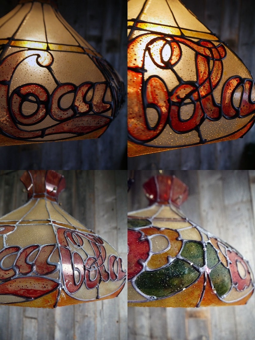 アメリカで買い付けましたビンテージのCoca-Colaプールランプです。お馴染みのロゴデザインで、明かりを付けると褪せた色味も綺麗でとても雰囲気があります。あまり見かけないシェードデザインに温かみのあるハンドペインティング仕様で、表記はありませんがデザインから1960〜70年代前後頃に使用されていたランプになります。シェードはプラスチック製で、ソケット、コンセントコードは新品に交換済みですぐにご使用頂けます。電球は付属しませんので、市販の26mm口径の一般的なタイプですのでご用意ください。状態ですが多少の小傷、金具にサビ汚れ、擦れや表面の汚れや生産工程上にできた内側の気泡、わずかな内側にヒビ、画像の様に表面シード角に細かいカケ等はありますが、点灯確認済みでディスプレイには問題ない状態です。ただあくまでビンテージのためご理解いただける方のご購入をお願いします。