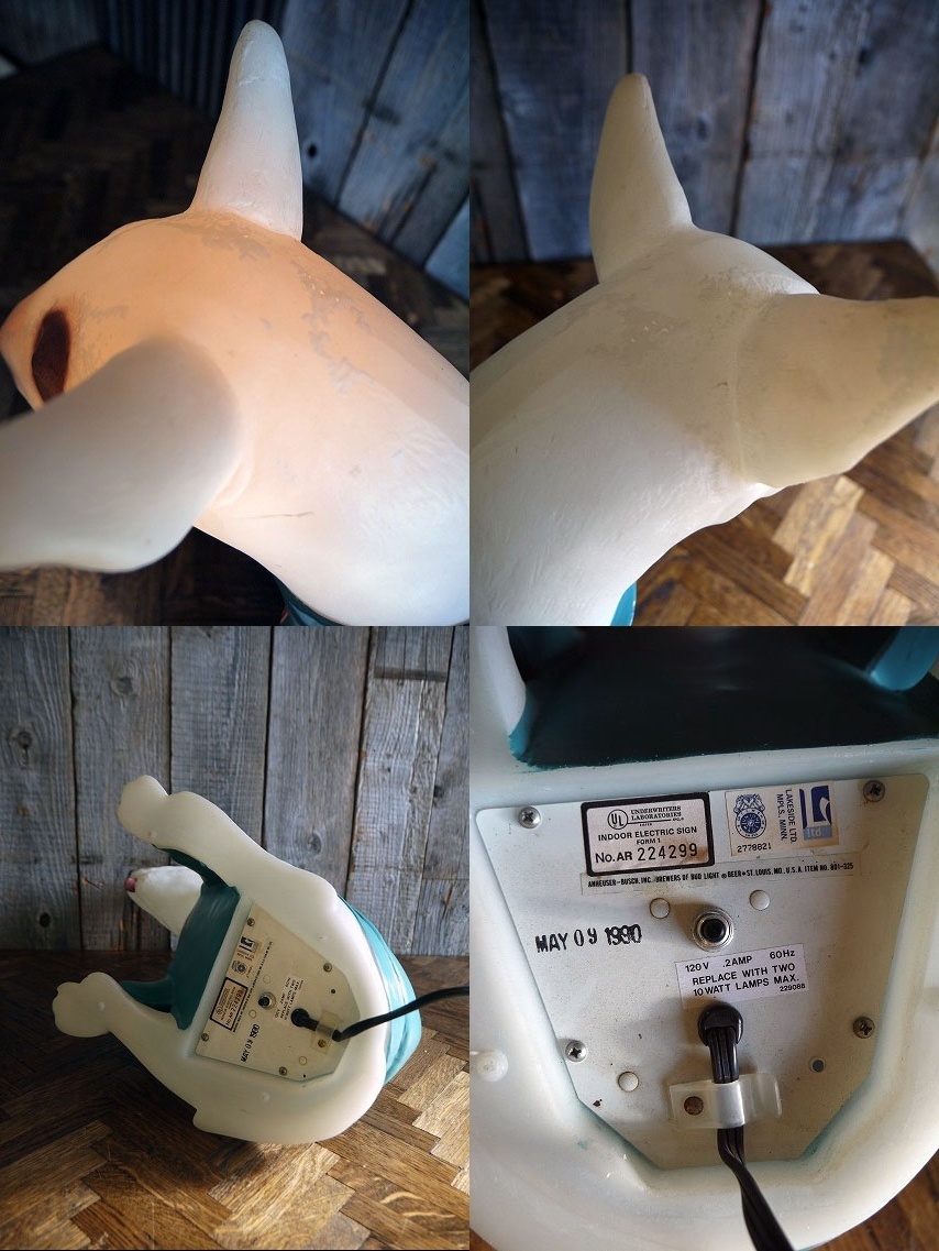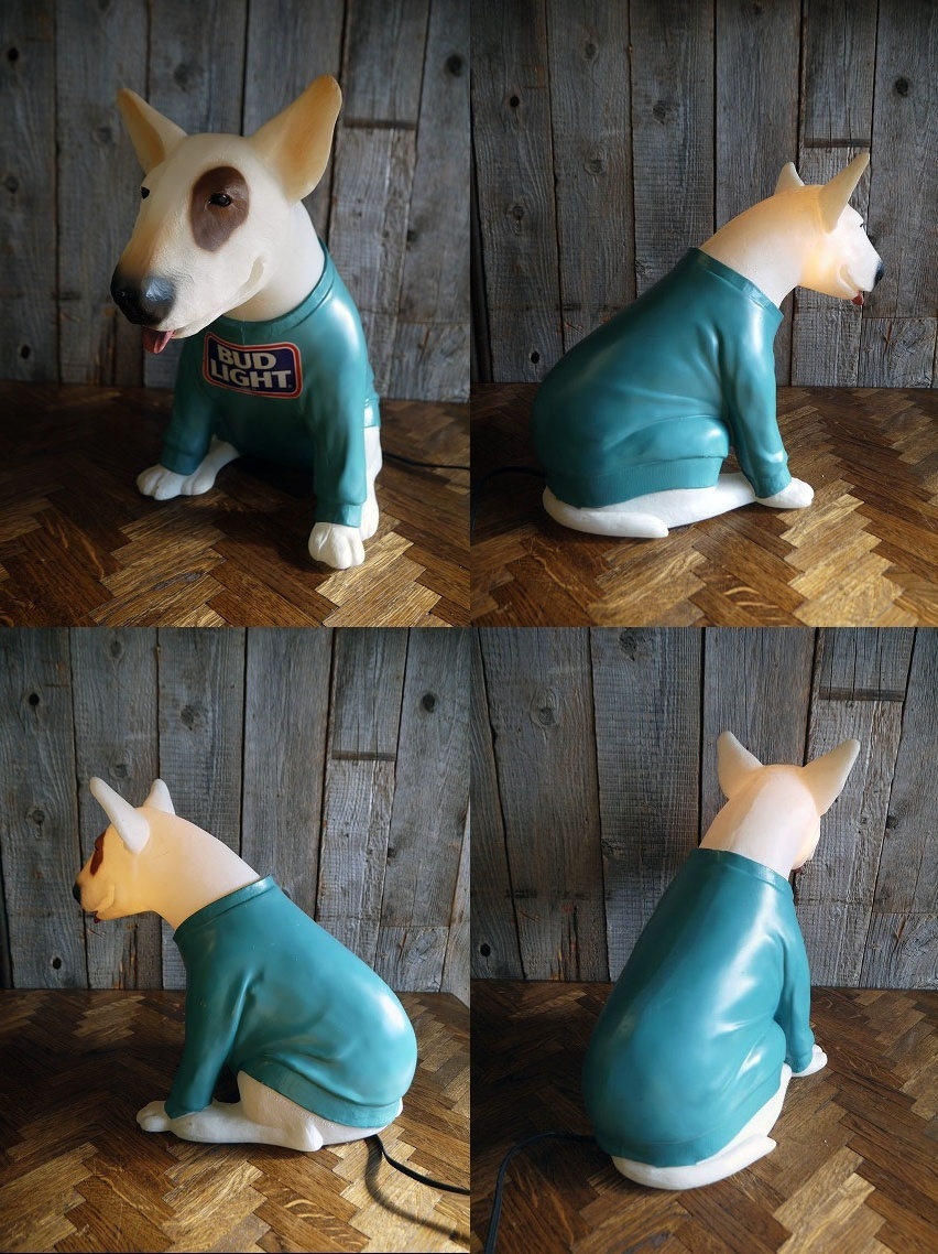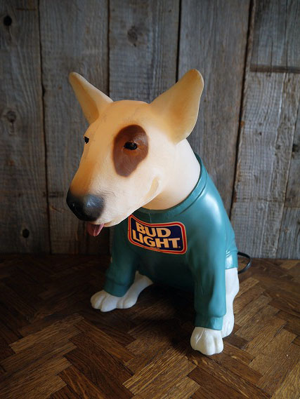 アメリカで買い付けましたビンテージのBUD LIGHTバドライト ライトサインです。アルコールドリンクメーカーのキャラクター犬のスパッズマッケンジー(ブルテリアモチーフ)の愛嬌ある表情が可愛らしいです。点灯時の柔らかな質感も最高でお部屋やショップのディスプレイには最高のアイテムです。1990年5月9日製造のハードプラスチック製で、オリジナルコンセントで仕様でアース棒が付いていますで抜いて頂くか変換プラグが必要になります。内部にはE-12口径の電球が2ついていますので電球が切れた場合はご用意下さい。状態は多少の細かい擦れ傷、画像の用に足のペイントロス、頭部部分の塗装の浮きや劣化等はありますがライトも画像の通り点灯確認済みで全体的には使用感もなく良いです。ビンテージになりますのでご理解いただける方のご購入をよろしくお願い致します。