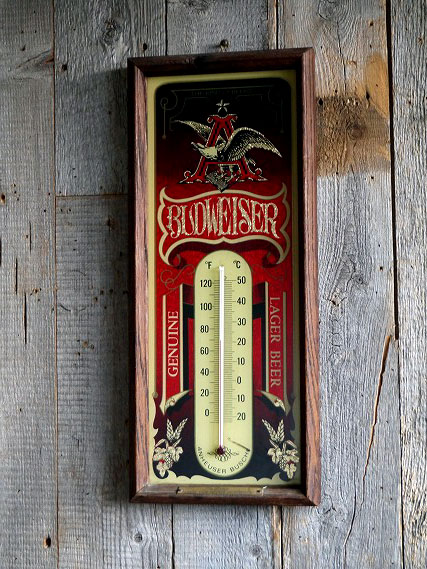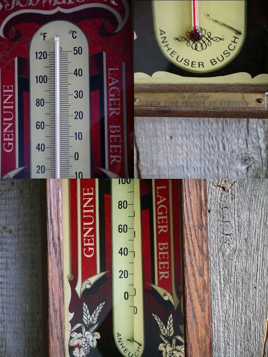 アメリカにて買い付けましたビンテージのBudweiser パブミラーです。アメリカミズーリ州セントルイスに本社を持つアンハイザー・ブッシュ社の銘柄パブミラーで、ウッドフレームにオシャレでクラシカルなデザインと木枠の風合いも良くとても雰囲気があります。ウッド×ガラス素材の温度計付きでお部屋からショップのディスプレイまで幅広くおすすめです。年代の表記はありませんがデザインから1970年代頃になるかと思います。状態ですが経年による木枠に小傷やスレ、カケや多少ミラーにくすみやプレートに汚れなどはありますが目立たない程度で年代を考えると良いと思います。あくまでビンテージのためご理解いただける方のご購入をお願いします。
