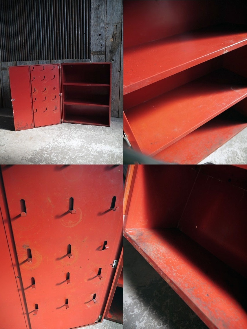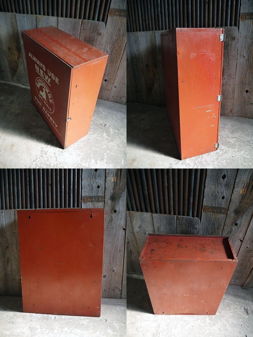 アメリカで買い付けたビンテージのSAFETY NATIONAL OIL SEALSキャビネットです。老舗モーターベアリング関連メーカーの販売用ディスプレイキャビネットで、多少色褪せたレッドカラーにブランドロゴデザインがとても雰囲気があります。内側には固定式の3段3列の棚板仕様で、ガレージモーターアイテムなどのちょっとした小物、パーツ等の収納やディスプレイにはとても便利なメタルラックです。メタル素材で、表記はありませんがデザインから恐らく50〜60年代初期頃になるかと思います。状態ですが、経年による傷、色褪せ、サビペンキ汚れ、角の凹み、塗装剥がれ、汚れなどはありますが、実用、ディスプレイに問題ない程度です。ただあくまでビンテージのためご理解いただける方のご購入をお願いします。