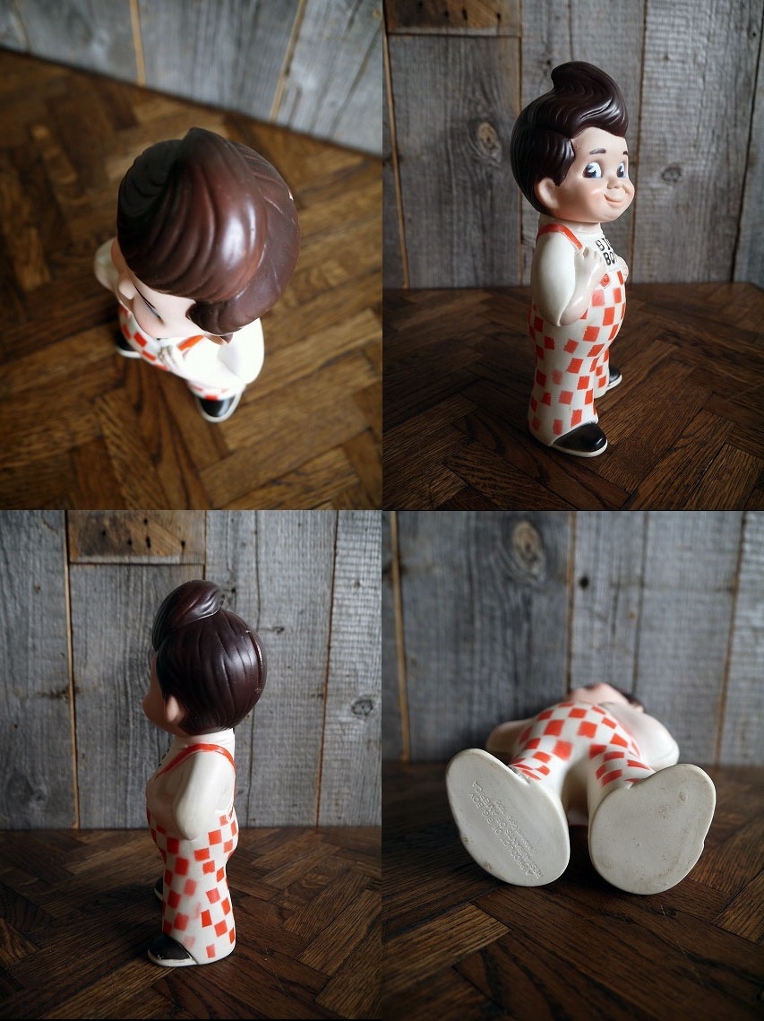 アメリカで買い付けましたビンテージのBIG BOYのソフビ人形です。アメリカで1936年に創業した老舗レストランのお馴染みの可愛らしいデザインになります。ソフビ素材で、底面に1973年のコピーライト表記がありますので、1970年代頃になるかと思います。お部屋のインテリアからショップ等のディスプレイまで幅広くおすすめです。状態は経年による多少の色褪せ、汚れ等はありますがディスプレイとしては問題ない状態で良いです。ただあくまでビンテージになりますのでご理解いただける方のご購入をお願いします。