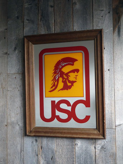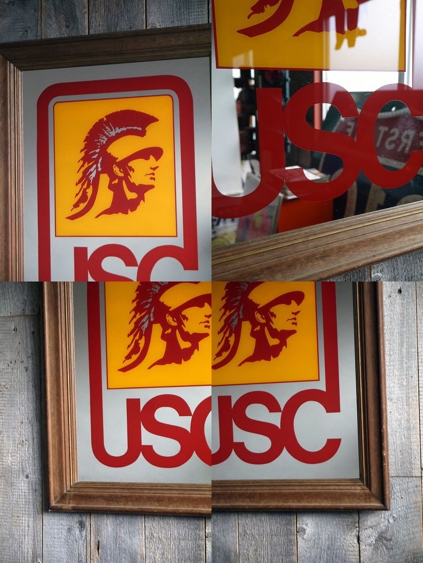 アメリカにて買い付けましたビンテージのUSC大型ミラーです。しっかりとした木枠フレームにカリフォルニア州ロサンゼルスを拠点とする南カリフォルア大学のカレッジロゴデザインがとても雰囲気があります。表記はありませんがデザインから1970年代頃のミラーになります。大き目のサイズでお部屋のインテリアからショップ等のディスプレイとして大変おすすめです。状態ですがミラー特有の多少のくすみや汚れ、フレームに多少の隙間、裏側の段ボールに細かい破れはありますがディスプレイとしては問題ない状態で良いです。あくまでビンテージになりますのでご理解いただける方のご購入をよろしくお願い致します。