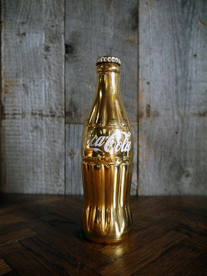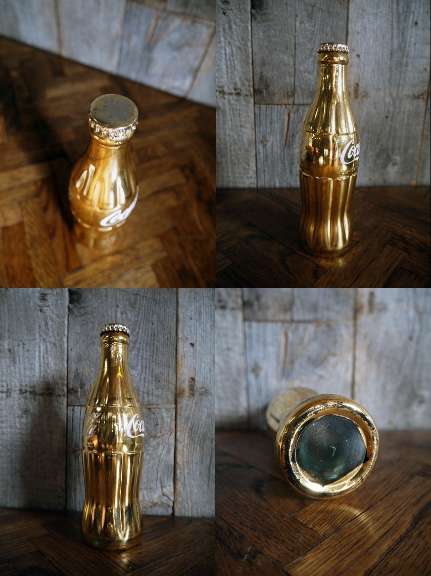 アメリカで買い付けましたビンテージのCoca-Colaボトル瓶です。お馴染みのCoca-Colaのボトルデザインがレトロな雰囲気です。GOLDメッキカラーに塗装されいてカッコイイです。ガラス素材で、恐らく1970年代辺りかと思います。状態ですが多少の傷、擦れ、塗装剥がれはりますが、割れなどの目立つダメージはなくディスプレイには問題の無い雰囲気のある状態です。ただあくまでビンテージですのでご理解いただける方の購入をよろしくお願いします。
