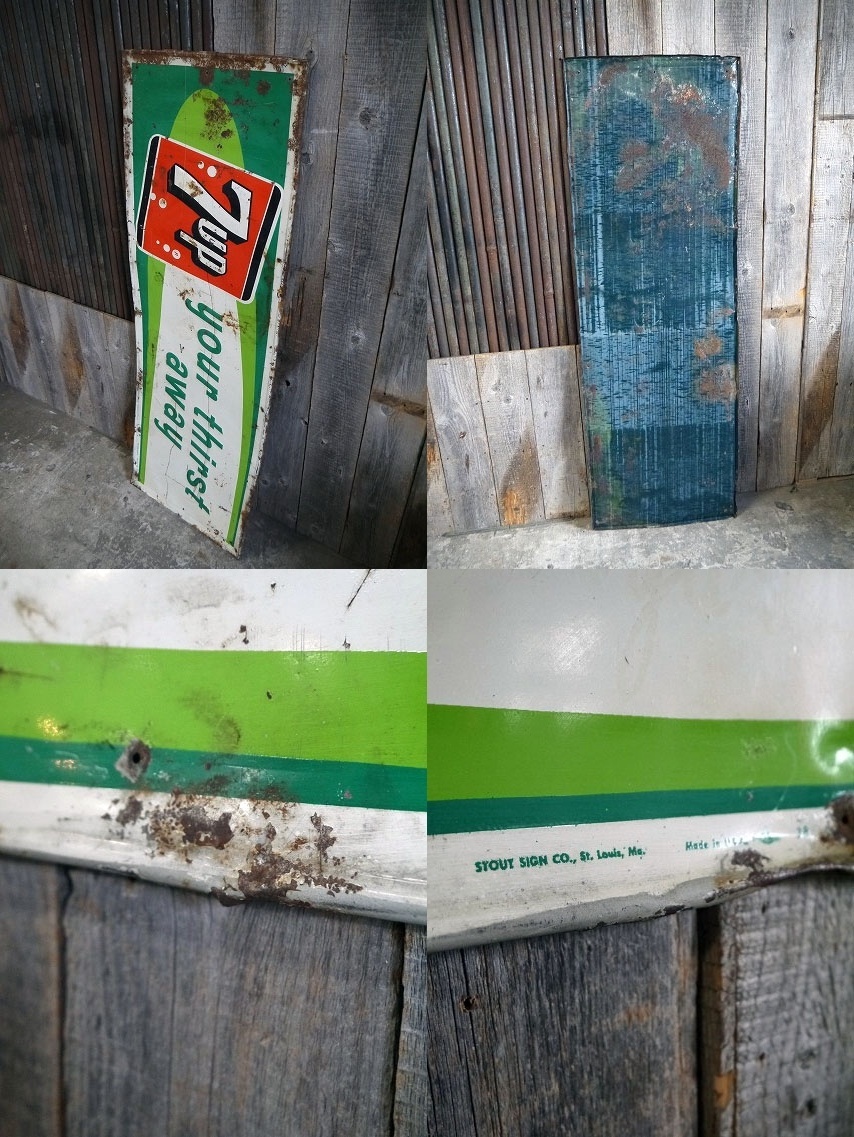 アメリカにて買い付けたビンテージの7UP Your thirst away大型サインです。人気ドリンクメーカーデザインの看板で、リアルなメタルの風合いとエンボスデザインが最高にカッコイイアイテムです。ブリキメタル(鉄)素材で、実際にアメリカのSHOPにて使用されていた希少な看板になります。コレクション兼ディスプレイとしておすすめです。下側の表記は5しか読みとれませんがデザインから1950年中期頃になります。状態ですが画像の様に経年による傷、擦れ、小穴、錆び、切れ込みや多少の凹みや歪み等はありますが外観を損なう感じのものではなく雰囲気のあるディスプレイには問題ない状態です。あくまでビンテージジャンクですのでご理解いただける方のご購入をよろしくお願いします。