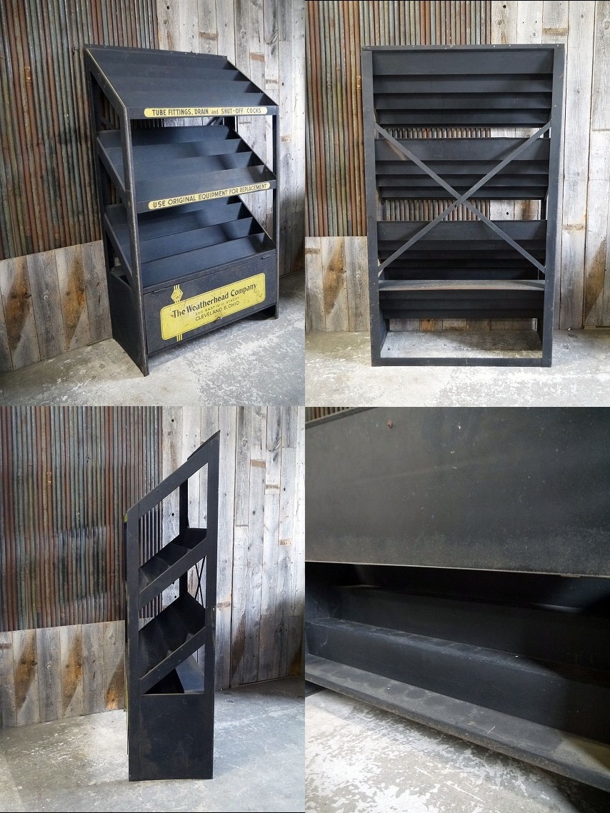 アメリカで買い付けましたビンテージWeatherHead大型パーツラックです。渋いブラックカラーに実際に使用されていたリアルなメタルの風合い&アメリカンなロゴデザインがとても雰囲気があります。アメリカのCARパーツ製品メーカーの販促陳列用ラックで、重厚感のある珍しい大型タイプで元々はガラス瓶を陳列していた棚になります。ガラス瓶やミニOIL缶等のディスプレイやガレージやショップのディスプレイ什器にとしておすすめです。メタル(鉄)素材で、表記はありませんがデザインから1940年〜50年代前後頃になります。状態ですが画像にあるように、上側看板部分の欠損、経年による使用感で全体的に金属劣化や錆、ペイント塗装の多少の剥がれ、凹み、側面に小穴、上側板に切れ込みや汚れ等はございますが、実用、ディスプレイには問題ないとても雰囲気のある状態で良いです。あくまでビンテージになりますのでご理解いただける方のご購入をよろしくお願い致します。