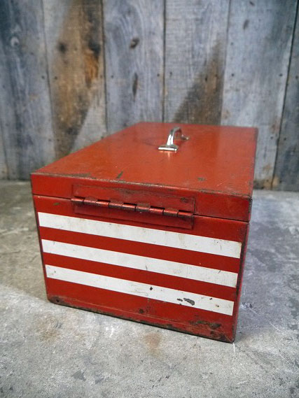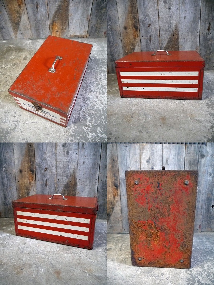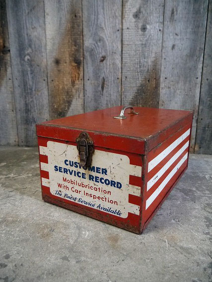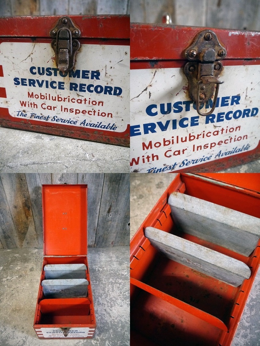 アメリカで買い付けましたビンテージのMobile COSTOMER SERVICE RECOROです。色褪せたトリコロールカラーにリアルなメタルの質感&バランスの良いデザインがカッコいいです。アメリカのMOTOR OILメーカーのメタルケースで、内側は細かく仕切られていて、取り外し可能です。メタル(鉄)素材で、表記がありませんがデザインから1960年代前後頃になります。お部屋等のディスプレイや小物の収納BOXとしてもオススメです。なかなか見かけないレアなメタルケースになります。状態ですが経年による多少の傷、擦れ、汚れやサビ、塗装剥がれや画像の様な多少の凹みや歪みなどはありますが、実用ディスプレイにも問題ない状態かと思います。あくまでビンテージになりますのでご理解いただける方のご購入をよろしくお願いします。