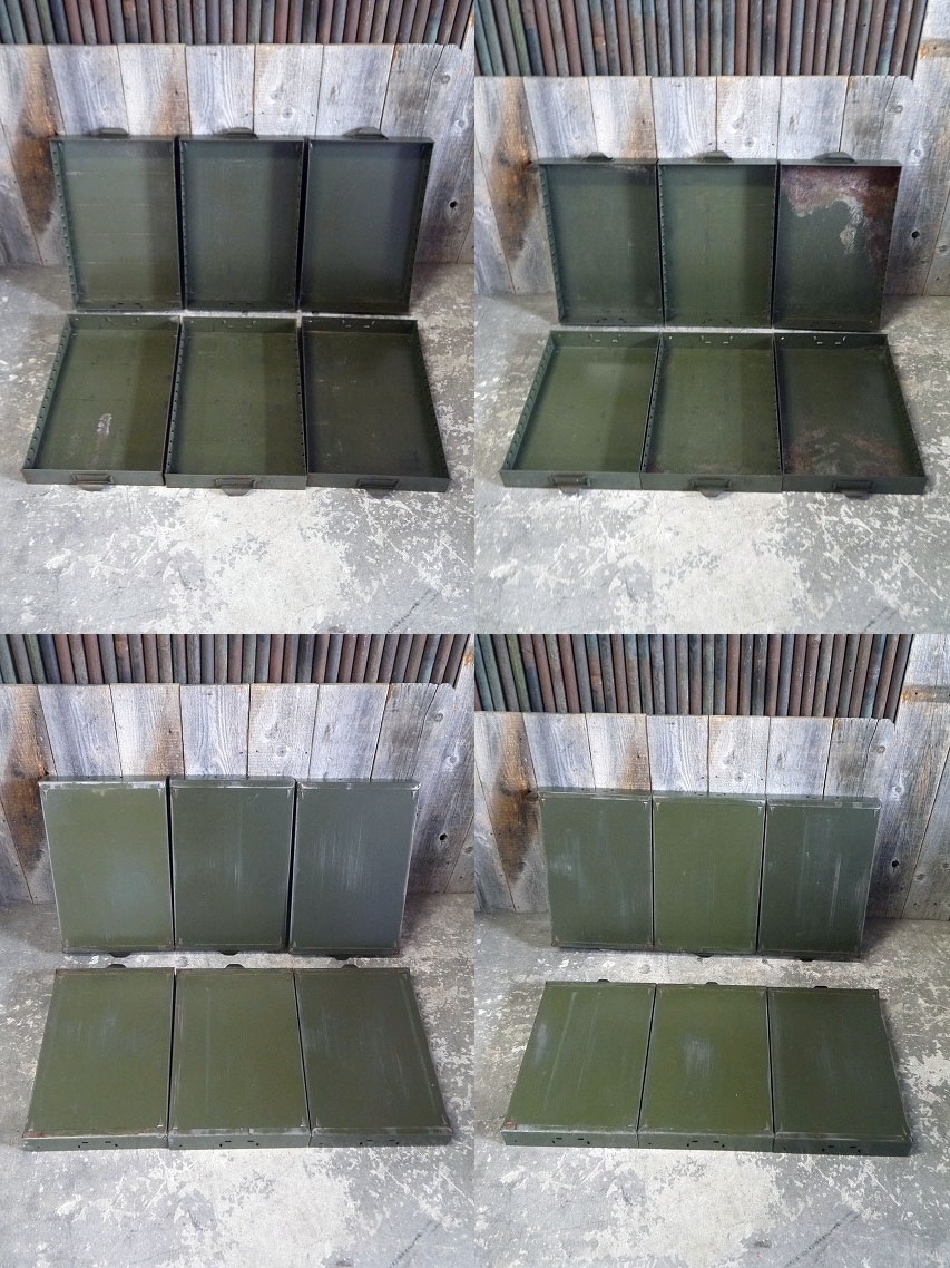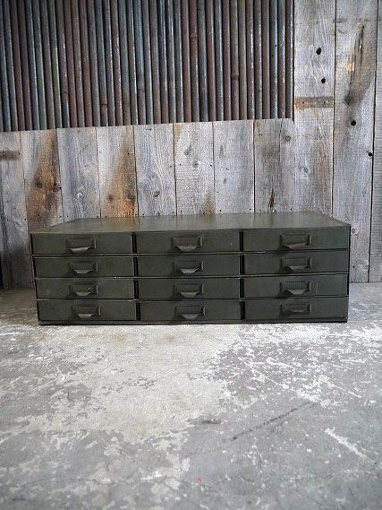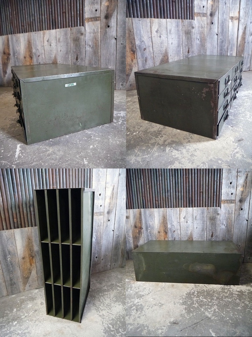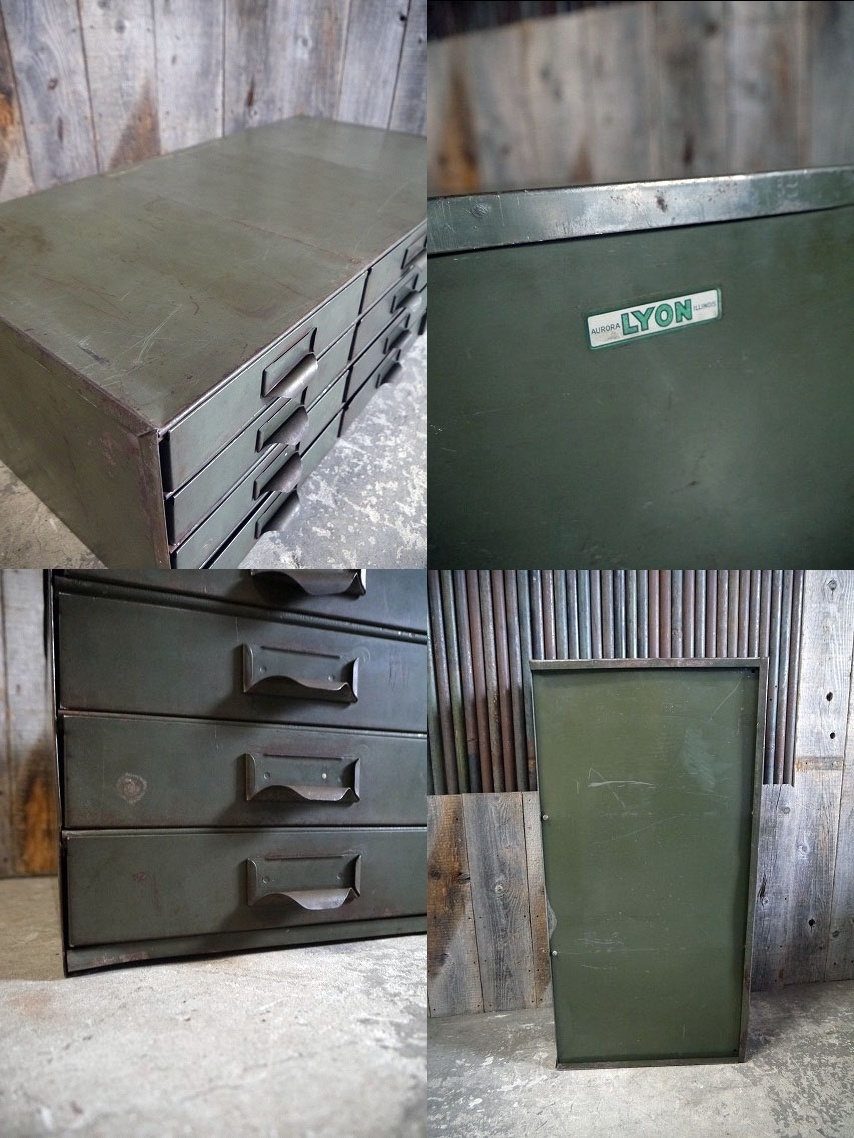 アメリカで買い付けましたビンテージのLYONメタルキャビネットです。人気のミリタリーグリーンカラーに重量感あるメタルの風合いにシンプルなロゴ&無骨なデザインがとても雰囲気がありカッコイイです。多少重量のあるメタル素材のしっかりとした作りで、4列×3段の計12個の収納BOX仕様で使いやすく、実用兼ディスプレイとしてお勧めです。内側の仕切り板は欠損しています。年代の表記はございませんがデカール&デザインから1950年代前後頃になるかと思います。状態ですが画像にあるように経年による金属劣化、天板や本体下側角の凹みBOXにサビ、小傷、擦れ、汚れ、仕切り板の欠損等はありますがしっかりした作りで、BOXの開閉スライドも比較的スムーズで実用にも問題ないレベルです。あくまでビンテージになりますので理解のある方のご購入をお願いします。