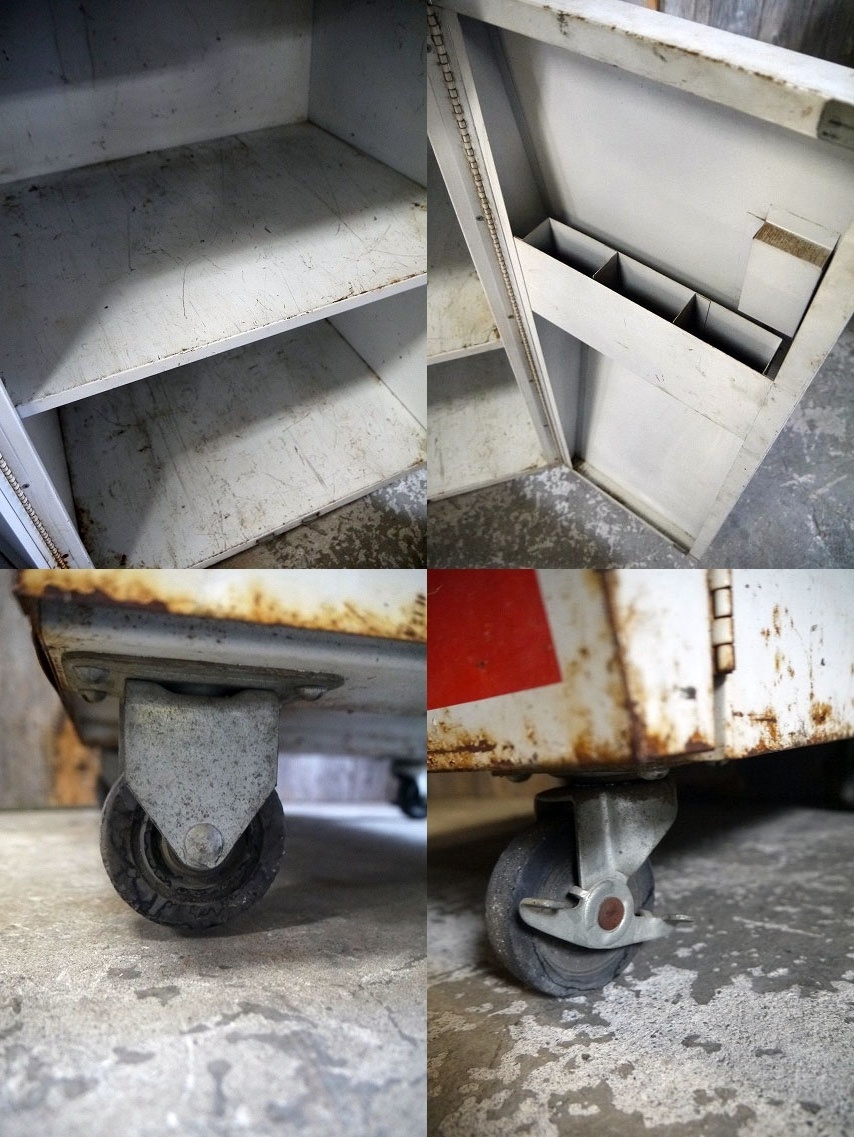 アメリカで買い付けたビンテージのAMERICAN PARTSキャビネットです。モーター関連メーカーのキャビネットで、色褪せたトリコロールカラーにシンプルなロゴデザイン&当時のステッカーがとても雰囲気があります。多少軽めのメタル(鉄)素材で、内側には固定式の棚板仕様で、ガレージモーターアイテムなどのちょっとした小物、パーツ等の収納やディスプレイにはとても便利なメタルラックです。表記はありませんがデザインから恐らく1970年代頃になるかと思います。鍵は南京錠にて施錠タイプで、扉の開閉は問題ありません。下側キャスターの動きは1か所多少動きにくい部分もあります。状態ですが、経年による傷、多少の色褪せ、塗装剥がれや劣化、天板に多少の凹みやキャスター部分のラバー劣化などはありますが、実用、ディスプレイに問題ない程度で雰囲気のある状態です。ただあくまでビンテージのためご理解いただける方のご購入をお願いします。
