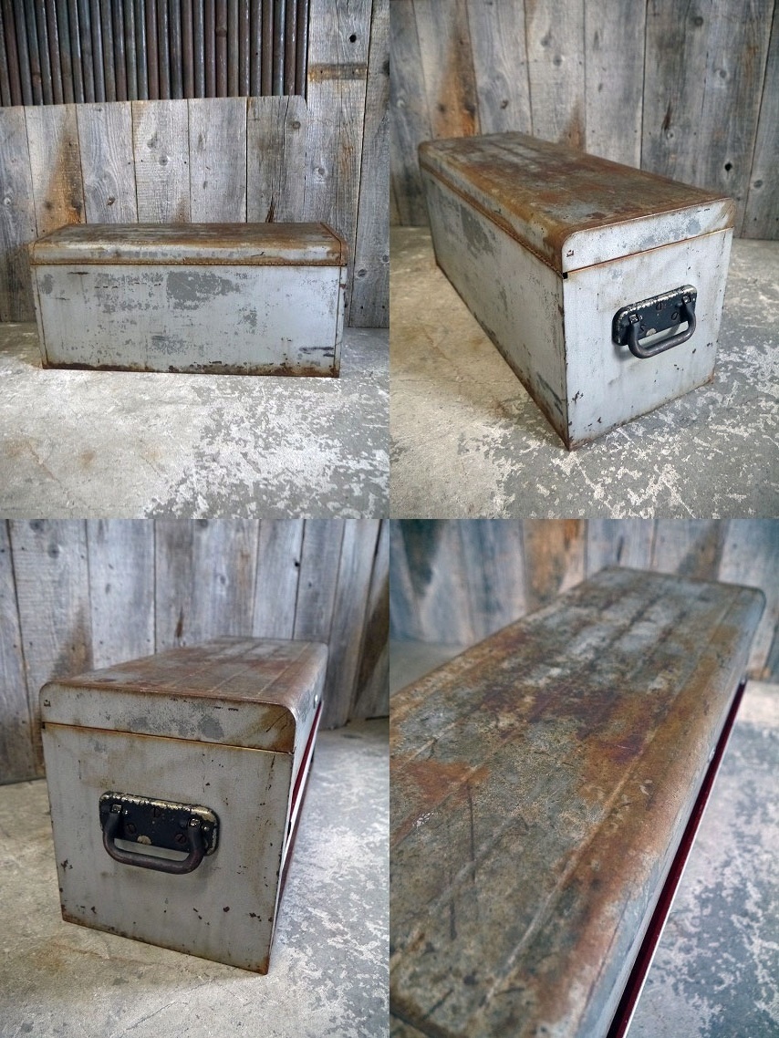 アメリカで買い付けましたビンテージのCRAFTSMAN TOOLキャビネットです。実際に使用されていたリアルなメタルの風合い&色褪せ&ペインティングされたブルーカラーにシンプルなロゴデザインが抜群に雰囲気があります。フロントは3段の引き出し仕様で非常に重厚感があり存在感抜群ですので、ガレージやショップのディスプレイ什器におすすめです。鍵や鍵金具はありません。年代の表記はありませんがロゴプレートデザインから1960年代頃になります。状態ですが画像にあるように、経年による使用感で全体的に金属劣化や錆、色褪せ、天板、下側部分に凹み、フロント金具欠で上蓋は完全には閉まりません。あと画像の様に上蓋サイドにチェーン取り付け、BOXの引き出しのスライドがきついのと一番下側片側の金具に欠損がありますので、手前まで引き出すと外れる場合があります。ペイント塗装の剥がれ、OIL汚れや多少の凹みやサビなどはありますが、実用にも問題ない雰囲気のある状態です。あくまでビンテージになりますのでご理解いただける方のご購入をよろしくお願い致します。