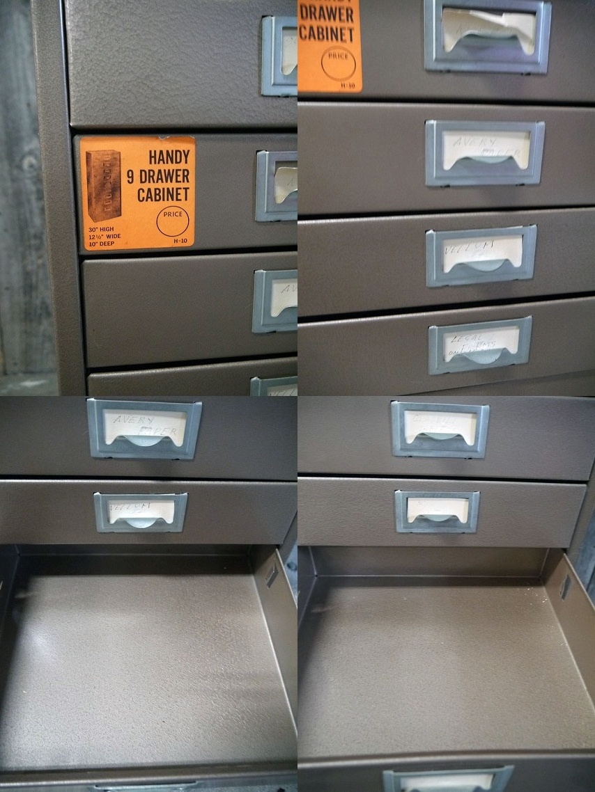 アメリカで買い付けましたビンテージのUSAメタルキャビネットです。ミリタリーグリーンカラーに重量感あるメタルの風合いにシンプルなロゴプレート&無骨なデザインがとても雰囲気がありカッコイイです。重量のあるスチールメタル素材のしっかりとした作りで、4段の収納BOX仕様で使いやすく、実用兼ディスプレイとしてお勧めです。書類等の収納キャビネットで、内側BOX部分にはスライド式のステーが各1枚付属します。(ファイルも付属しますが、フロントのつまみを回すと金具が外れます。)年代の表記はありませんが、デザインから恐らく1930〜40年代前後頃になるかと思います。鍵金具部分は壊されていて、内側の鍵金具に連動するステーは取り外されています。状態ですが画像にあるように経年による金属劣化、凹みや傷、鍵金具の壊れ、擦れ、汚れ、天板等に画像のような凹みなどはありますが、しっかりした作りで、BOXの開閉スライドも比較的スムーズで実用にも問題ないレベルです。あくまでビンテージになりますので理解のある方のご購入をお願いします。