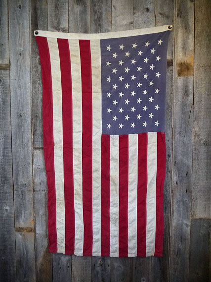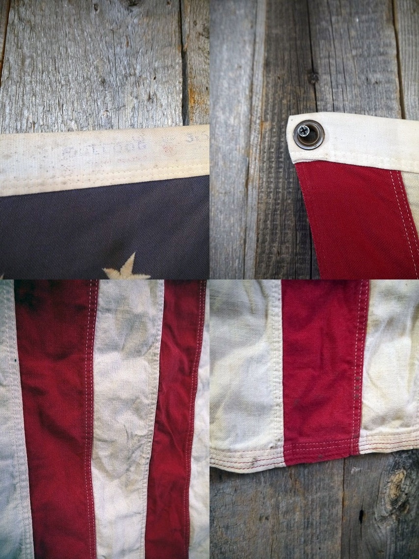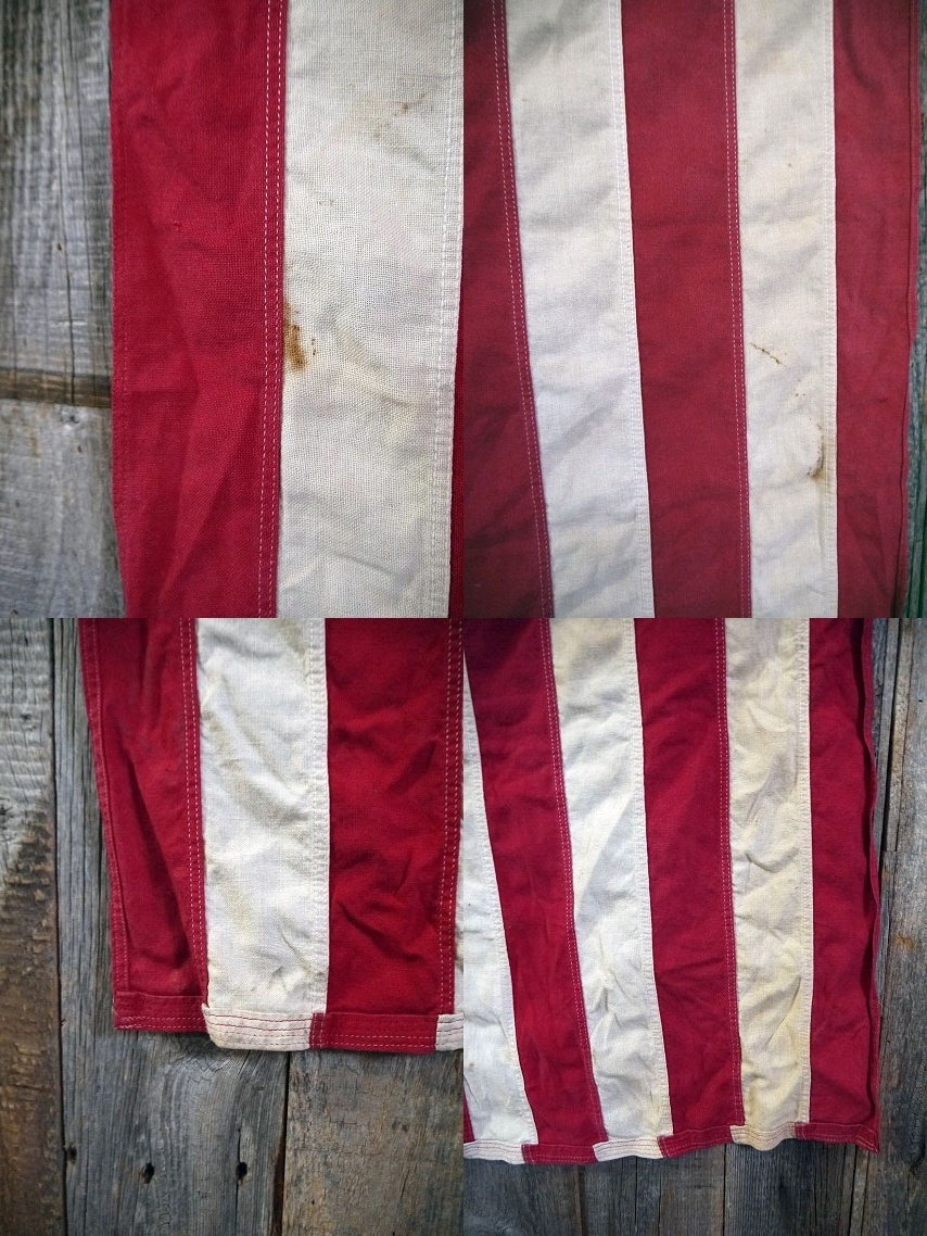 アメリカで買い付けたビンテージのD.STOCKのUSA星条旗です。STARS&STRIPISのデザインは定番ながら抜群カッコよさがあり、雰囲気を求められるショップ等にはディスプレイとして最適かと思います。 1960年7月4日から現在迄使われている定番50スターデザインでビンテージならではの生地感とフェード具合が抜群の雰囲気です。素材は100%コットン素材で、スター部分は刺繍デザイン、年代の表記はありませんが会座インから1970年代頃になります。状態は未使用ですが経年による折りたたみシワ、汚れやフェードはありますが、穴などの目立つダメージもなく、全体的にはディスプレイに問題ない雰囲気のある状態です。あくまでビンテージですのでご理解いただける方のご購入をよろしくお願いします。