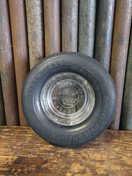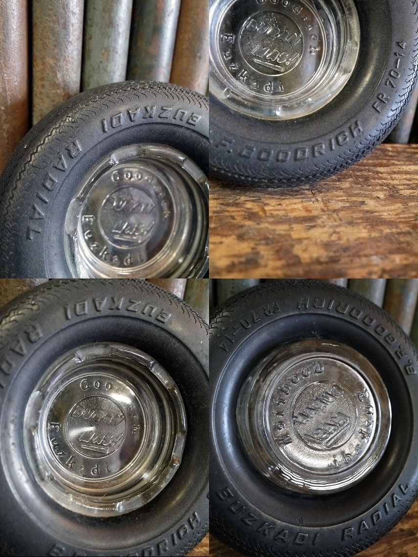 アメリカにて買い付けてきましたビンテージのGoodRichガラス灰皿です。クリアガラスにビンテージパターンのタイヤとお馴染みのメーカーロゴデザインもカッコ良く雰囲気があります。ガラス灰皿部分にはエンボスロゴ入りのデザインになります。お部屋からショップのディスプレイまで幅広くおすすめです。年代の表記はありませんがデザインから1940〜50年代前後頃かと思います。状態ですが、傷や擦れ、ガラスにくすみや小傷、多少の汚れ、多少の塗装劣化や剥がれ、タイヤラバーの硬化等はありますがディスプレイには問題ない状態です。あくまでビンテージになりますので理解のある方のご購入をお願いします。