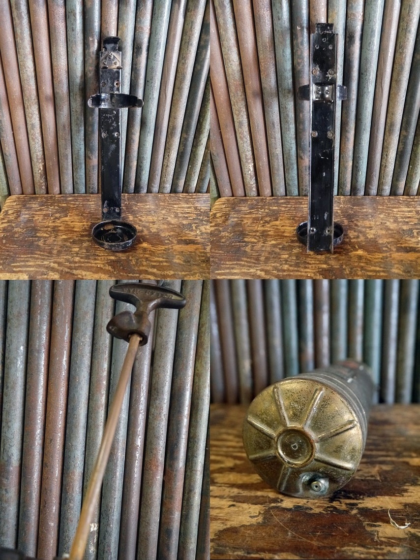 アメリカで買い付けてきましたアンティークのFyr-Fyter Extinguisher(消火器)です。重厚感のあるメタルの風合いとアメリカンなプレートロゴ&デザインが抜群の雰囲気がありますのでディスプレイにおすすめです。真鍮&銅素材で中身は入っていません。ステー付きで年代の表記はありませんがデザインから1920〜30年前後頃になるかと思います。状態ですが、擦れ、傷や錆汚れ、ステーに凹みや歪みなどはみられるもの全体的にはアンティークならでの雰囲気でディスプレイには問題ない状態です。あくまでアンティークジャンクになりますのでご理解いただける方のご購入をよろしくお願い致します。