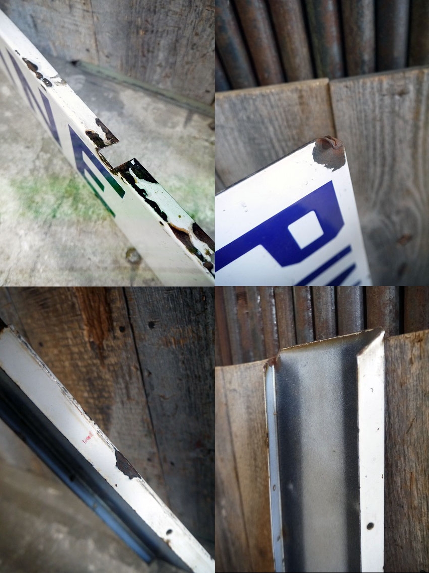 アメリカで買い付けてきたビンテージのPINE ST.ホーローストリートサインです。ホワイトカラーベースに実際に使用していたリアルな傷の雰囲気があり非常にかっこいいです。ホーロー仕様で年代の表記はありませんがデザインから1940年代頃になるかと思います。状態ですが多少の擦れ、傷、汚れ、錆び、表面のカケや画像の様に角に凹みや歪みなどはありますがジャンク好きの方でしたら恐らく問題ないレベルです。 ただあくまでビンテージジャンクになりますので理解いただける方のご購入をよろしくお願いします。