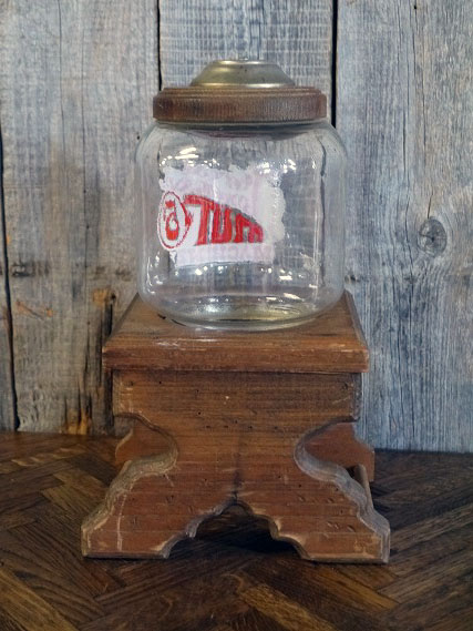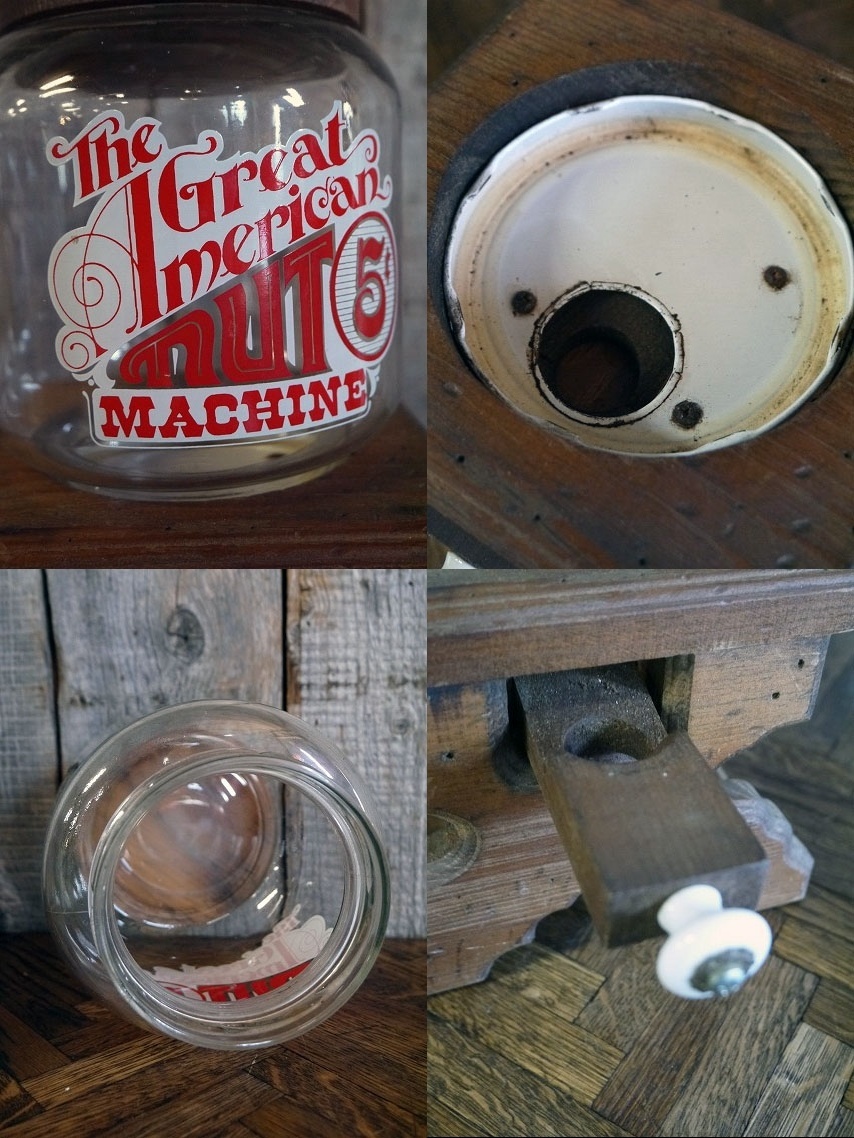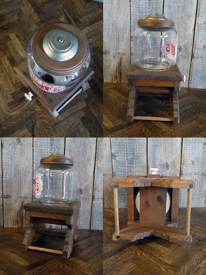 アメリカで買い付けてきましたビンテージのNUTSディスペンサーです。アメリカンなデザインとウッドの風合いがとても雰囲気があります。ウッドスタンドタイプで、下側の取っ手を引くと中身が出てきます。厚めのガラス瓶で、瓶を回すとスタンドから取り外せます。古いものになりますので、お店のディスプレイとしてオススメです。上蓋部分の接着は劣化してほとんどは外れて欠損していますがこちらも付属しています。年代の表記はありませんがデザインから1970年代〜80年前後頃になります。状態ですが、経年経過による多少の使用感で擦れ、ペイントロス、ウッド部分に汚れや傷、画像ではわかりにくいのですですがガラス部分に生産工程上に出来た多少の凹凸、金属部分に多少のサビはありますが、目立つ様なダメージも無くディスプレイには問題ない状態で良いです。ただあくまでビンテージですのでご理解いただける方のご購入をよろしくお願いします