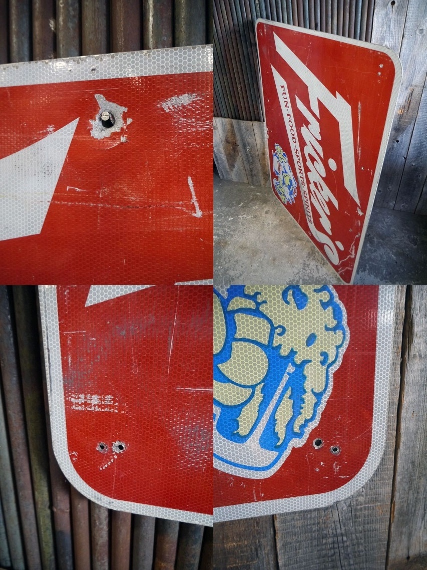 アメリカから買い付けましたUSAのFricker's大型看板です。アメリカのレストランフードのチェーン看板で、レッドカラーリング&マスコットのチキンデザインがインパクトがあります。スチールアルミ素材の反射板のプリントデカールタイプの看板で、裏面から2002年1月製になります。1990年に創業ですのであまり古さはありませんが、アメリカのフリーウェイ出口などで実際に使われていた看板で、あまり市場には出回らない大型看板になります。状態は傷や擦れ、多少の凹みや裏側にマジック落書きなどの使用感がありますがディスプレイには問題ない状態です。あくまでユーズドになりますのでご理解いただける方のご購入をお願いします。