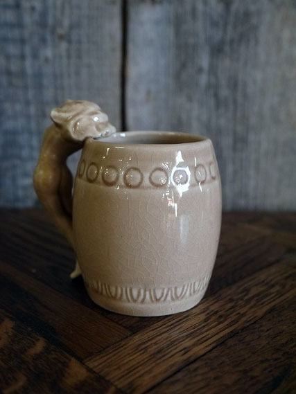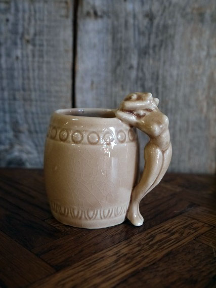 アメリカで買い付けましたビンテージのピンナップガールマグカップです。ベージュカラーに持ち手がピンナップガールになっているデザインでとても雰囲気があります。陶器素材で底面の表記はありませんがデザインからKindell社製の1950年代頃になるかと思います。状態は多少の薄い汚れ、画像の様に経年経過や生産工程上に出来たと思われる表面のひび割れ、小さな黒い点はありますが、目立つダメージは無く、ディスプレイには問題の無い状態で良いです。ただあくまでビンテージですのでご理解いただける方の購入をよろしくお願いします。