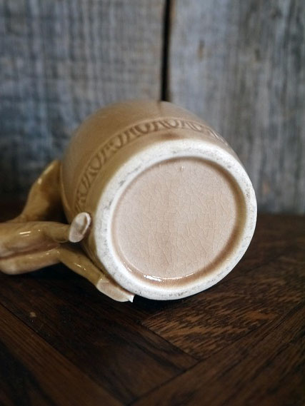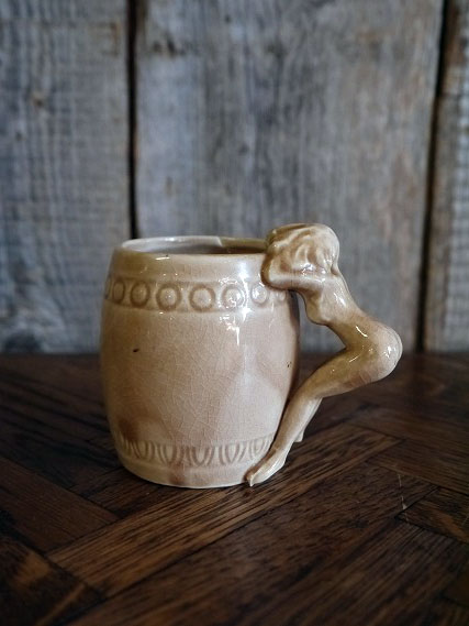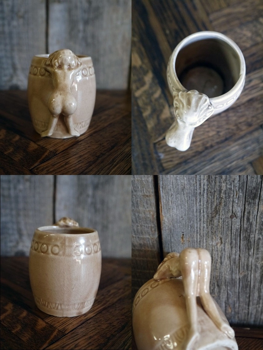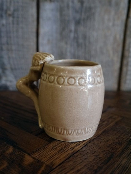 アメリカで買い付けましたビンテージのピンナップガールマグカップです。ベージュカラーに持ち手がピンナップガールになっているデザインでとても雰囲気があります。陶器素材で底面の表記はありませんがデザインからKindell社製の1950年代頃になるかと思います。状態は多少の薄い汚れ、画像の様に経年経過や生産工程上に出来たと思われる表面のひび割れ、小さな黒い点はありますが、目立つダメージは無く、ディスプレイには問題の無い状態で良いです。ただあくまでビンテージですのでご理解いただける方の購入をよろしくお願いします。