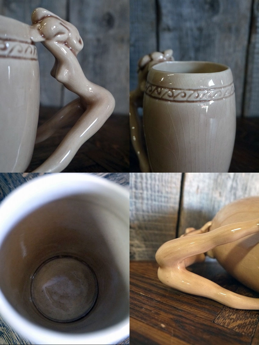 アメリカで買い付けましたビンテージのピンナップガールマグカップです。ベージュカラーに持ち手がピンナップガールになっているデザインでとても雰囲気があります。陶器素材で底面の表記はありませんがデザインからKindell社製の1950年代頃になるかと思います。状態は画像の様に経年経過や生産工程上に出来たと思われる表面のひび割れ、小さな黒い点はありますが、目立つダメージは無く、ディスプレイには問題の無い状態で良いです。ただあくまでビンテージですのでご理解いただける方の購入をよろしくお願いします。