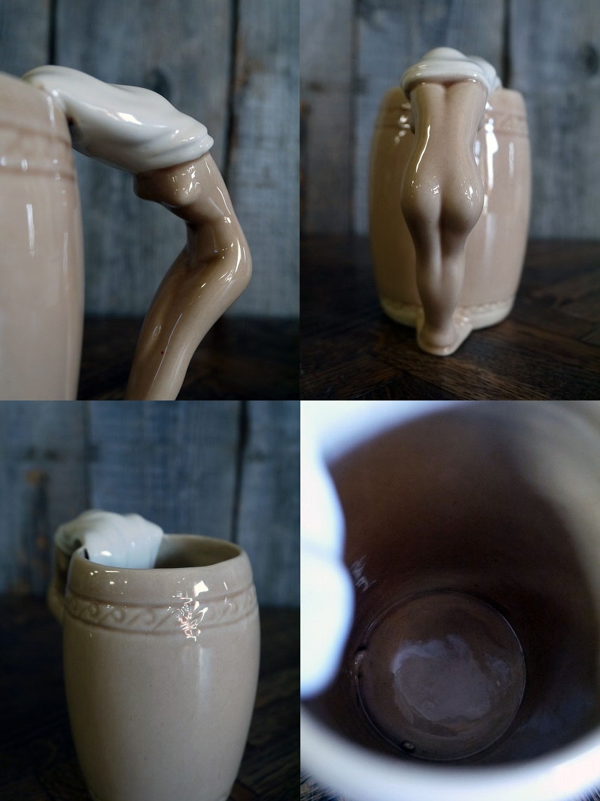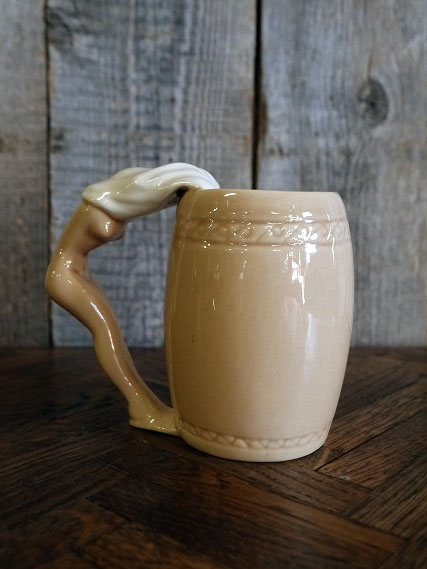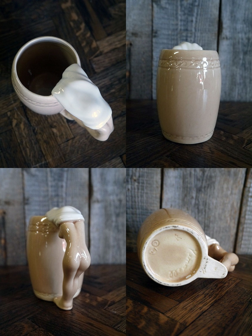 アメリカで買い付けましたビンテージのピンナップガールマグカップです。ベージュカラーに持ち手がピンナップガールになっているデザインでとても雰囲気があります。陶器素材で底面の表記はありませんがデザインからKindell社製の1950年代頃になるかと思います。状態は画像の様に経年経過や生産工程上に出来たと思われる表面のひび割れ、小さな黒い点はありますが、目立つダメージは無く、ディスプレイには問題の無い状態で良いです。ただあくまでビンテージですのでご理解いただける方の購入をよろしくお願いします。