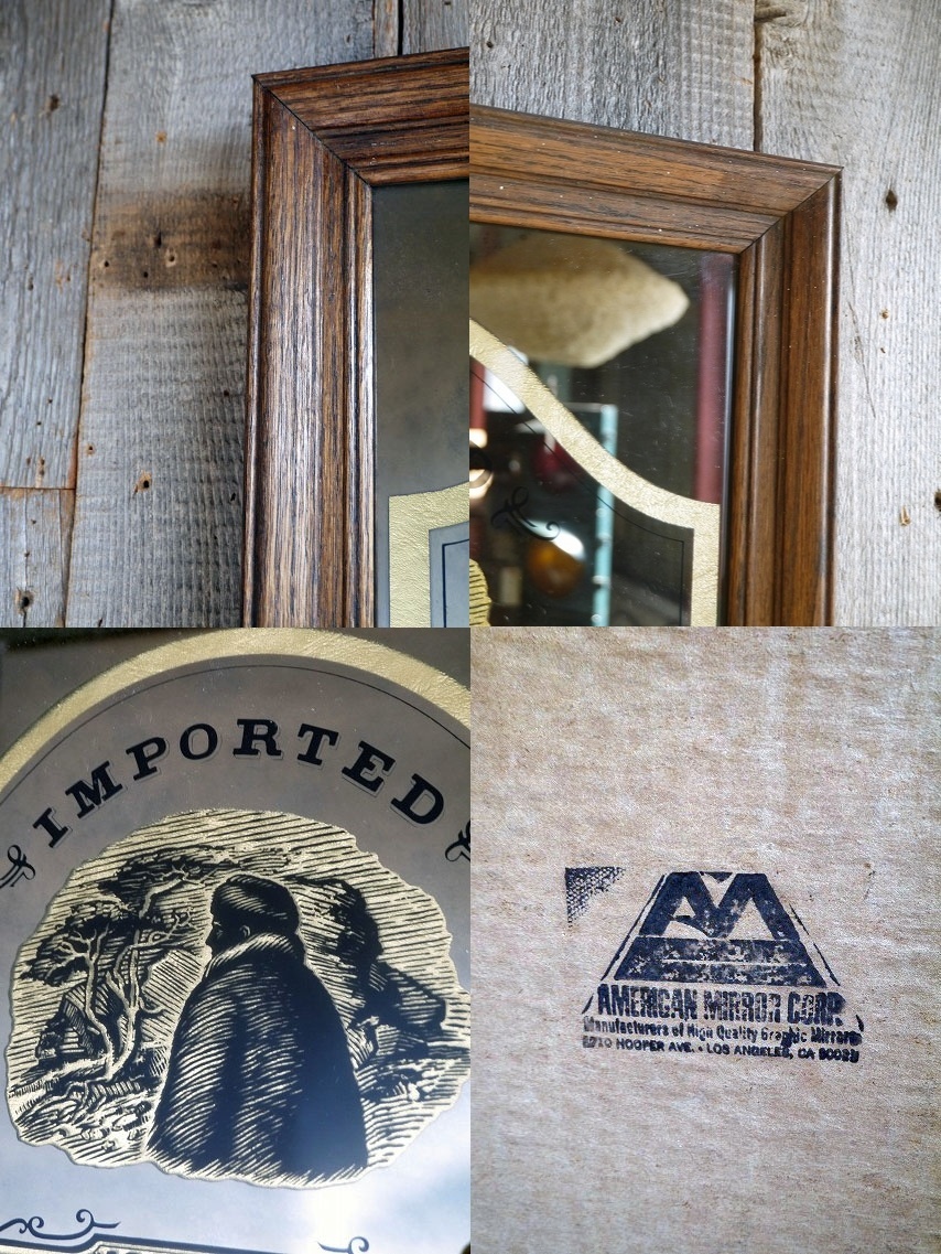 アメリカにて買い付けましたビンテージのYUKON JACKパブミラーです。カナダのリキュールのブランド銘柄のパブミラーで、オシャレなデザインと木枠フレームの風合いもとても雰囲気があります。ウッド×ガラス素材(ゴールド部分はペーパー)で、1983のコピーライト表記がありますので、1983年〜80年代中期頃のパブミラーになるかと思います。お部屋からショップのディスプレイまで幅広くおすすめです。状態ですが、木枠に傷、ミラーのくすみや擦れ、裏側ペーパーに汚れなどはありますが雰囲気を損なうような目立つダメージはなく、ディスプレイには問題のない状態です。あくまでビンテージのためご理解いただける方のご購入をお願いします。