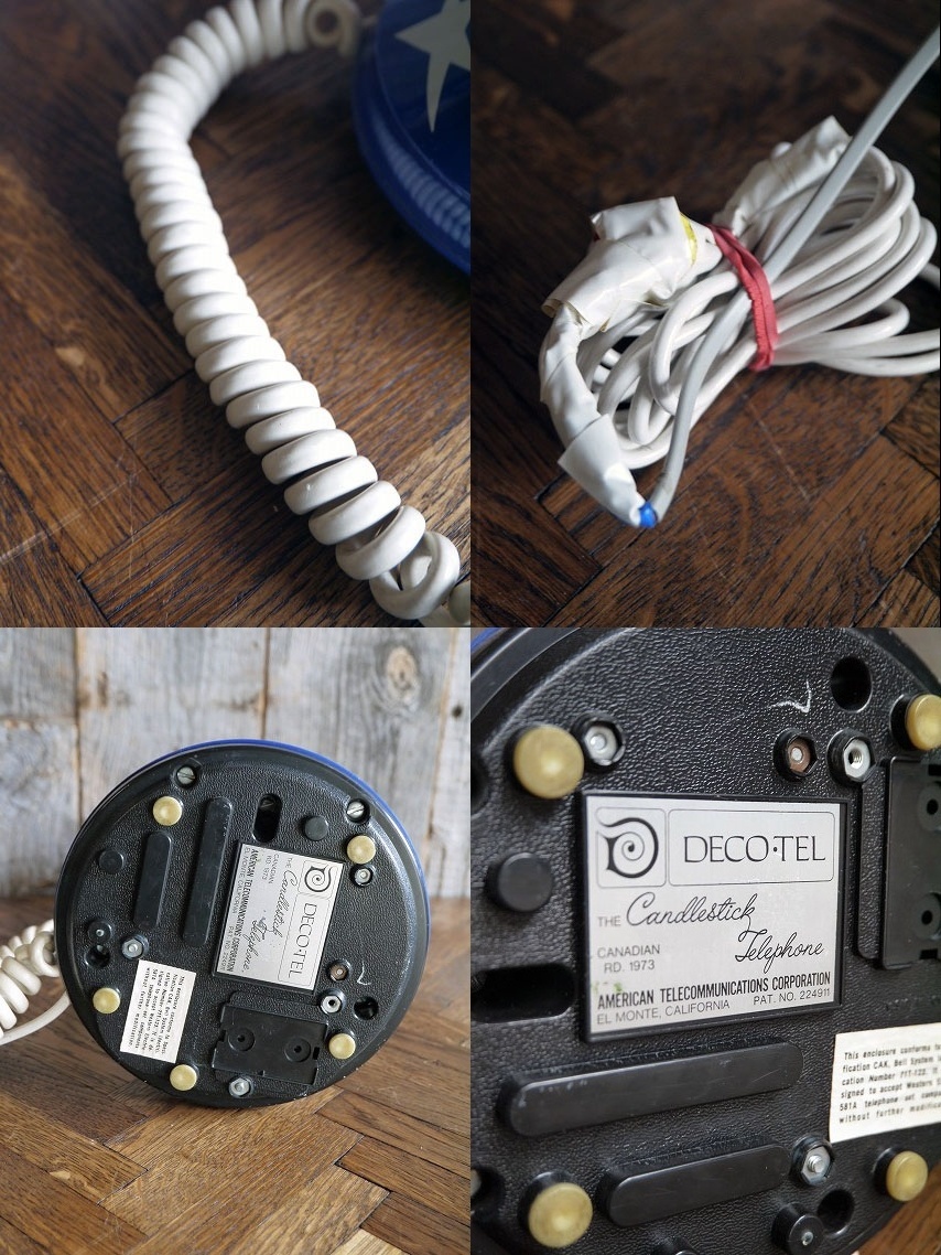 アメリカで買い付けましたビンテージ70'sの星条旗電話機です。トリコロールカラーにスター&ストライプスのアメリカンでPOPなデザインが魅力です。American Telecommunications社製になります。プラスチック素材のUSA製で、動作確認はしていません。古い商品になりますのでディスプレイ用のJUNKとしてお考え下さい。底面に1973のコピーライト表記がありますので1973年〜70年代頃になります。状態です多少の小傷や擦れ、コードに汚れやテープ補修といった使用感はありますが本体部分は綺麗でディスプレイとしては問題ない状態で良いです。ただあくまでビンテージになりますのでご理解いただける方のご購入をお願いします。