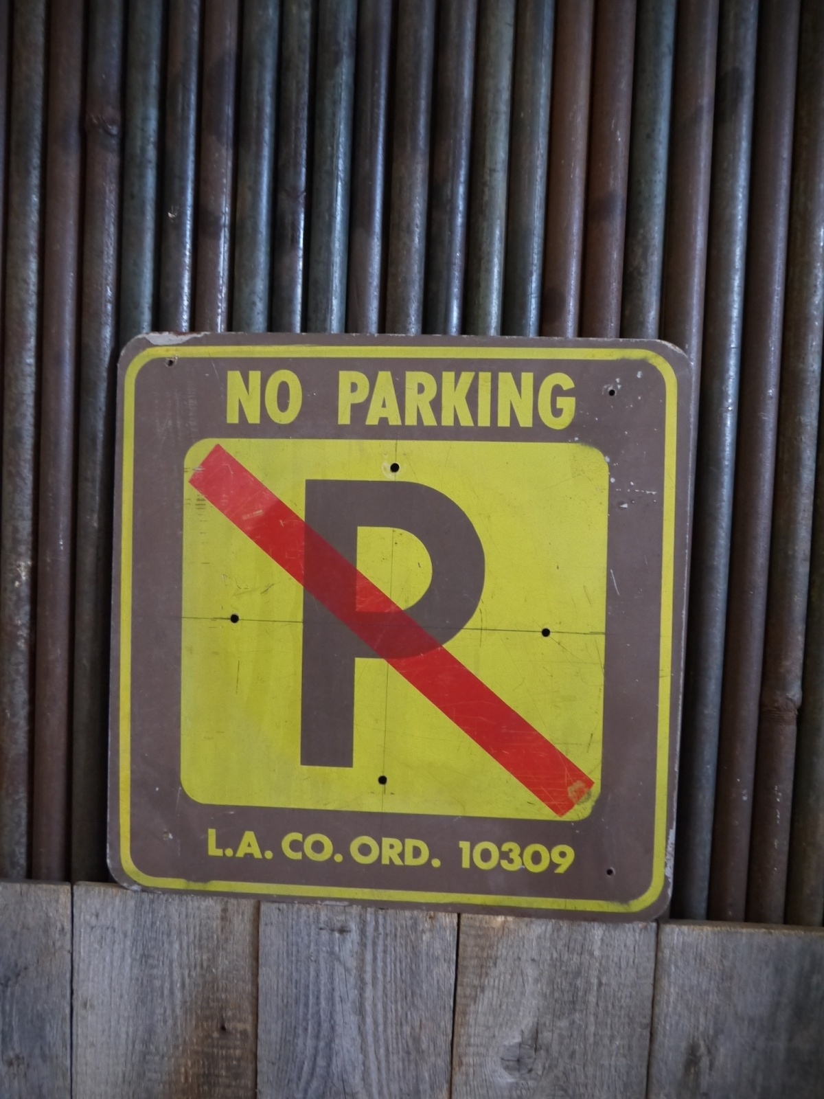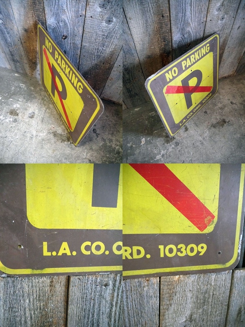 アメリカで買い付けましたビンテージのNO PARKINGサインです。色褪せたイエロー×ブラウンのカラーリングにリアルな傷や汚れがとても雰囲気がありカッコイイです。メタル(鉄)素材のペイント仕様の当時のハンドメイドで、年代の表記はありませんがデザインから1980年代頃かと思われます。状態は傷や擦れ、汚れ、画像の様に表面塗装剥がれ、取付けられていたと思われる小穴、ペンラインなどはありますが、アメリカンジャンクならでディスプレイには問題ない雰囲気のある状態です。あくまでビンテージですのでご理解いただける方の購入をよろしくお願いします。