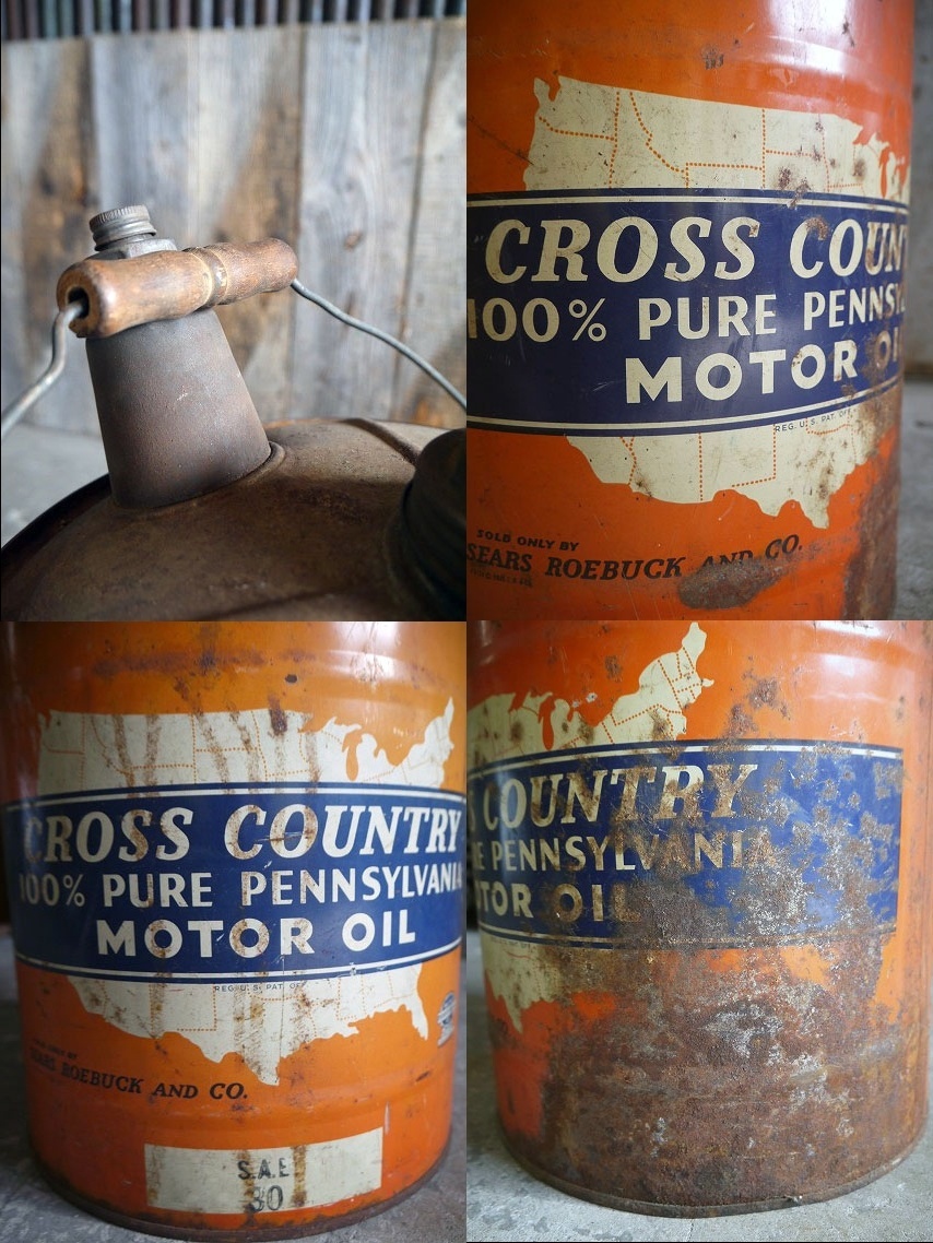 アメリカで買い付けたビンテージのCROSS COUNTRY OIL缶です。色あせたオレンジベースのカラーリングにUSAデザインとメタルの風合いがとても雰囲気があります。コレクタブルなアイテムで、ガレージのディスプレイ什器としてもおすすめです。SEARS ROEBUCK社製で年代の表記はありませんがデザインから1940年後期〜50年前後頃になるかと思います。中身は入っていません。状態は金属劣化、サビ、塗装剥がれ、傷、多少の凹みや画像の様なOILサビ汚れ等の使用感はありますが、ディスプレイには問題ない雰囲気のある状態かと思います。ただあくまでビンテージジャンクになりますのでご理解いただける方のごご購入をお願いします。
