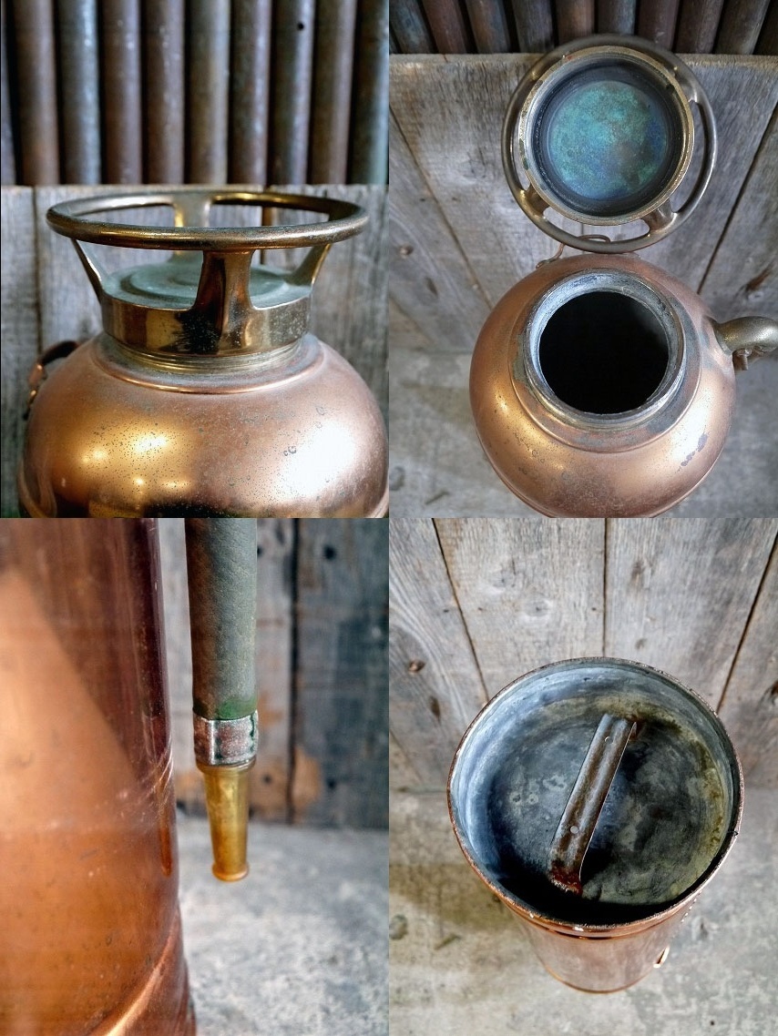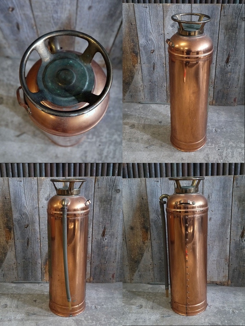 アメリカで買い付けてきましたアンティークのQUICK AIDメタル消火器です。重厚感のあるメタルの風合いとアメリカンなプレートロゴ&デザインが抜群の雰囲気がありますのでディスプレイにおすすめです。中身は入っていません。オリジナルのホースで、内側容器は付属しません。年代の表記はありませんがデザインから1940年代頃になるかと思います。状態ですが、多少の傷、画像の様にフロントプレートに歪みや汚れやホースの多少の硬化劣化、錆びなどはみられるもの全体的にはアンティークならでの雰囲気でディスプレイには問題ない状態で良いです。あくまでアンティークジャンクになりますのでご理解いただける方のご購入をよろしくお願い致します。