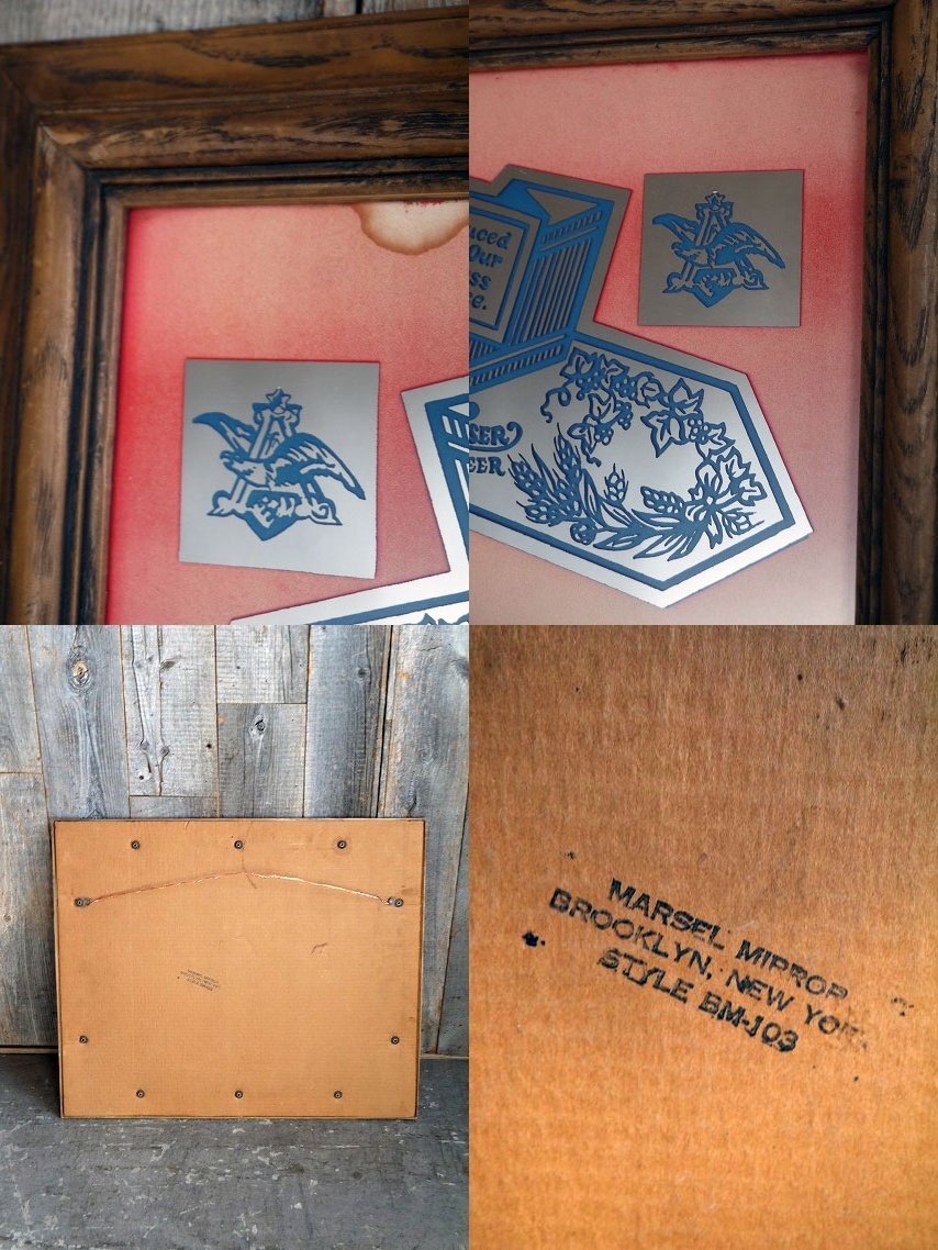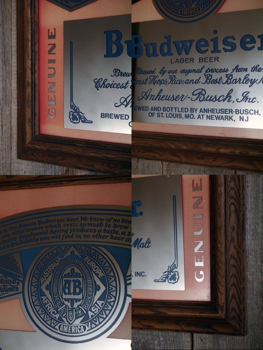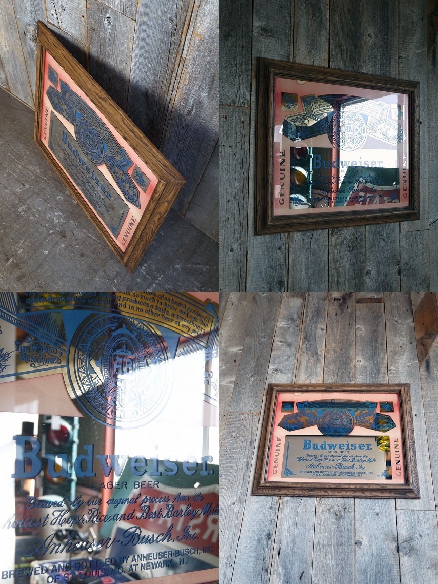 アメリカにて買い付けましたビンテージのBudweiserバドワイザーパブミラーです。人気ビールメーカーでOLDアメリカンなロゴデザインと木枠モチーフデザインの風合いも良くとても雰囲気があります。手頃なサイズでお部屋からショップのディスプレイまで幅広くおすすめです。ガラス×プラスチックフレームで、内側の色褪せた赤い部分はペーパーになります。年代の表記はありませんがデザインから1970年代後期〜1980年前後頃か思います。状態ですが経年によるプラスチックフレームに小傷やスレ、ミラーの多少のくすみや画像の様に赤いペーパー部分に色褪せや汚れ、裏側ボードにしみ汚れや段ボールの変形などはありますが雰囲気を損なうような目立つダメージは無くディスプレイには問題ない状態だと思います。ただあくまでビンテージのためご理解いただける方のご購入をお願いします。