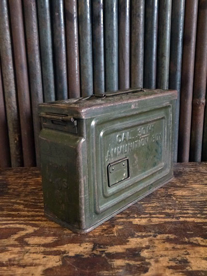 アメリカで買い付けましたビンテージのAMMUNITION BOXです。色褪せたミリタリーグリーンカラーに重厚なメタルの質感&バランスの良いエンボスロゴデザインが最高にカッコいいです。メタル(鉄)素材で、年代の表記はありませんが、デザインから1940年代に第二次世界大戦で実際に使用されていた弾薬BOXで上蓋はしっかりと閉まります。お部屋等のディスプレイや小鍵などの小物の収納BOXとしてもオススメです。状態ですが経年による多少の傷、擦れ、サビ汚れなどはありますが、しっかりとした作りで実用ディスプレイにも問題ない状態です。あくまでビンテージになりますのでご理解いただける方のご購入をよろしくお願いします。