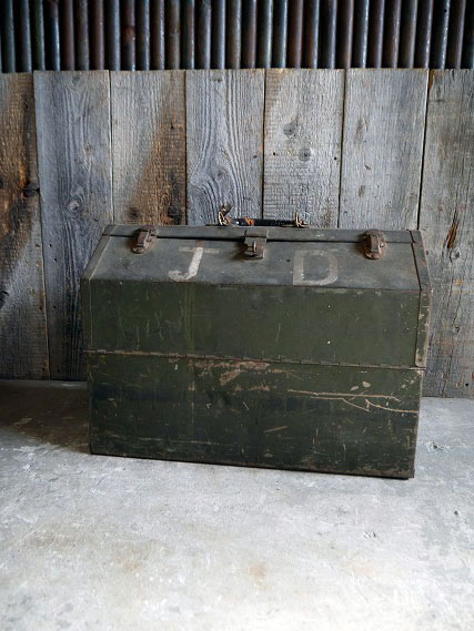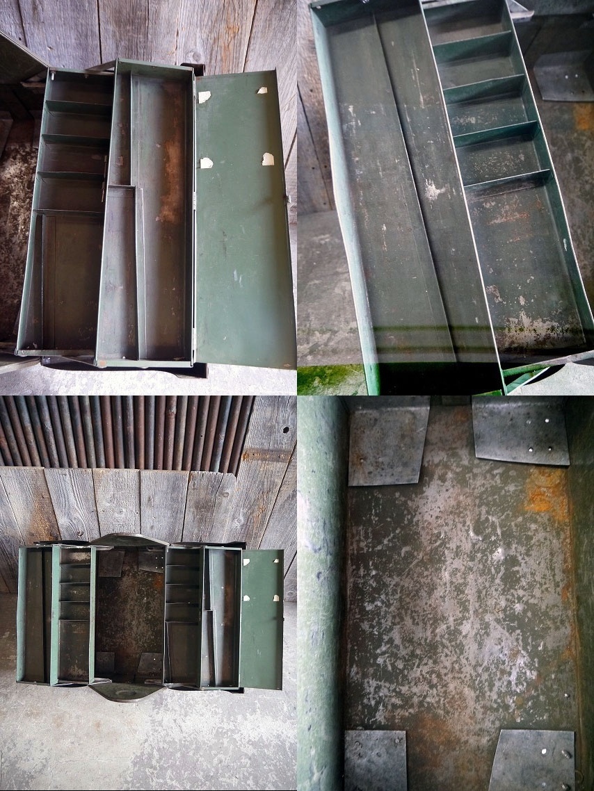 アメリカで買い付けましたビンテージのSimonsenTOOLBOXです。渋いミリタリーグリーンカラーにリアルなメタルの風合いとペンキロロゴ&内側のロゴデカールもとても雰囲気があります。メタル(鉄)素材で、持ち手レザー巻きの多少大き目のサイズ感で、パーツや工具の保管にちょうど良いサイズです。鍵は南京錠にて施錠タイプで、金具部分のロックや上蓋の開閉は特に問題ありません。年代の表記はありませんがデザインから1940〜50年前後頃になるかと思います。状態ですが、経年による傷や汚れ、レザー持ち手にダメージ、側面の金具、底面部分に外、内側からメタル板でのネジ補強や歪み、多少の凹み等はありますが雰囲気を損なう様な目立つダメージもなく全体的には実用にも問題ない状態です。あくまでビンテージですのでご理解いただける方のご購入をよろしくお願いします。